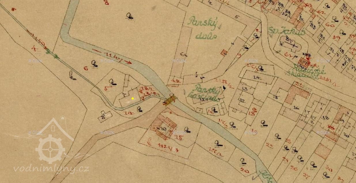Popis1930: 1 kolo na svrchní vodu, hltnost 0,178 m3/s, spád 4,5 m, výkon 7 HP