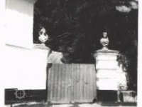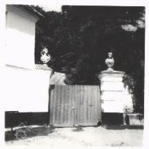 Mezi domem a bránou trhliny – nutno opravit. Jeden pilíř otlučen. Busty částečně zvětralé.