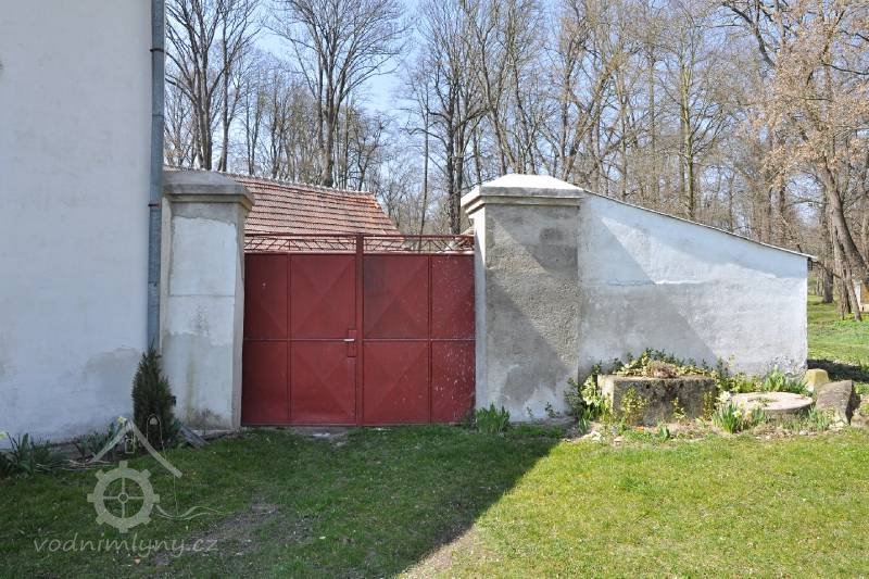 U mlýna památkově chráněná empírová brána s antikizujícími bustami, které byly již odcizeny a skládanými dřevěnými vraty, vyměněnými za plechová.