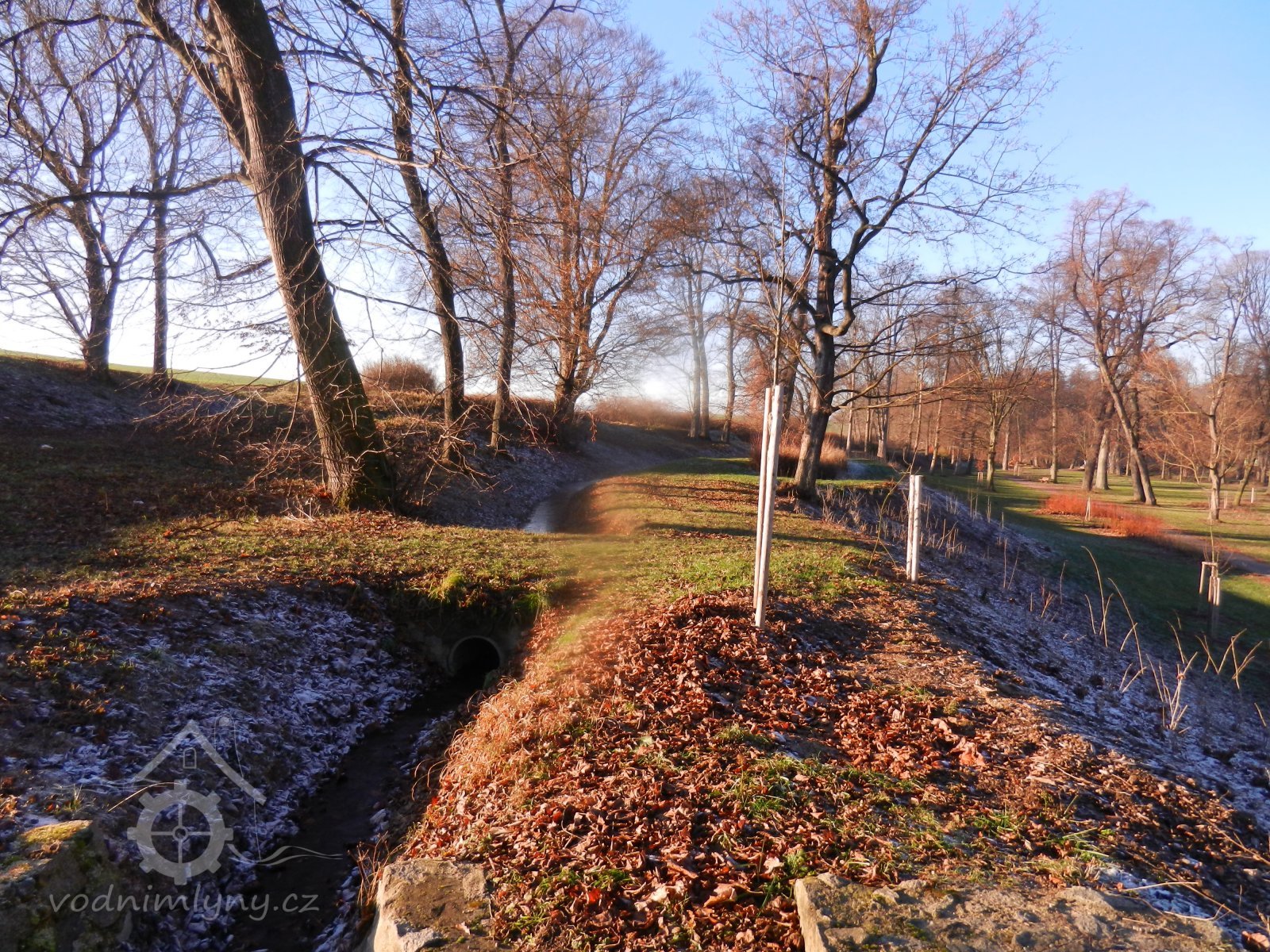 Jihozápadní dlouhou stranu zámeckého parku tvoří vyvýšený terénní zlom, po jehož hraně vede koryto bývalého náhonu vodního mlýna, zlom odděluje parkové údolí od okolního zemědělského extravilánu. Dalšími vodními prvky podílejícími se na tvářnosti parku je jihozápadní mlýnský náhon a rybník v západní části parku, obnovený roku 2002. Horní hrana parku bývala mlýnským náhonem, jenž mj. dodával potřebnou vodu pro provoz lázně, která měla podobu kruhové stavby.