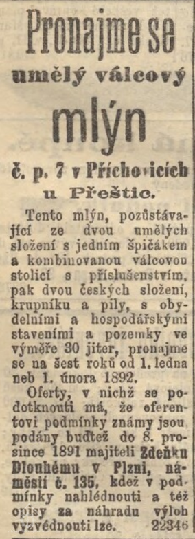 1891 mlýn nabízen k pronájmu, majitel Zdeněk Dlouhý z Plzně. (RR)