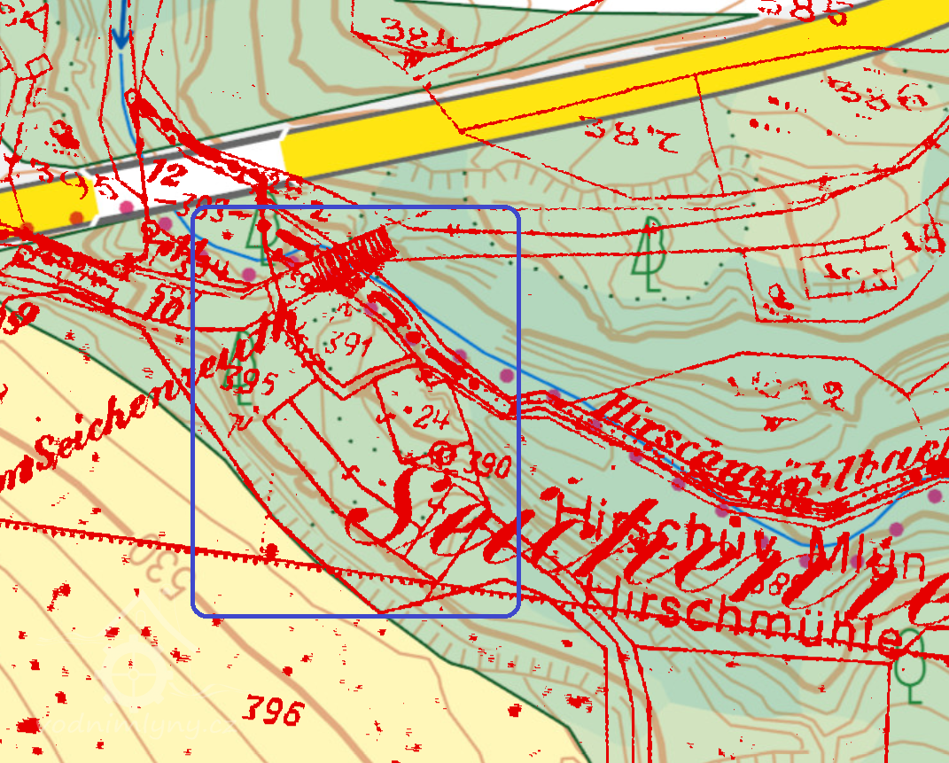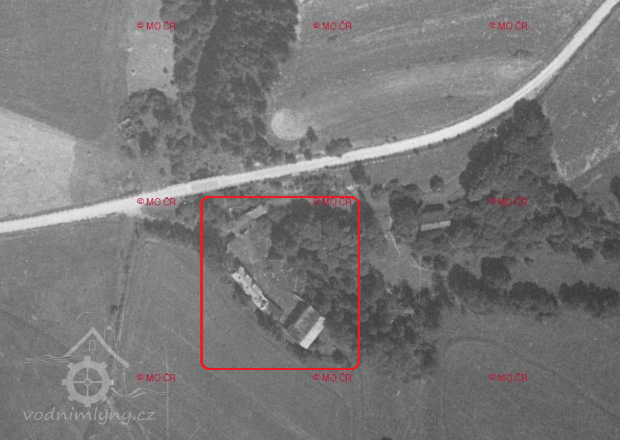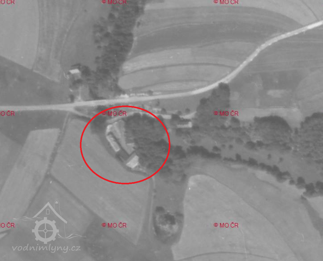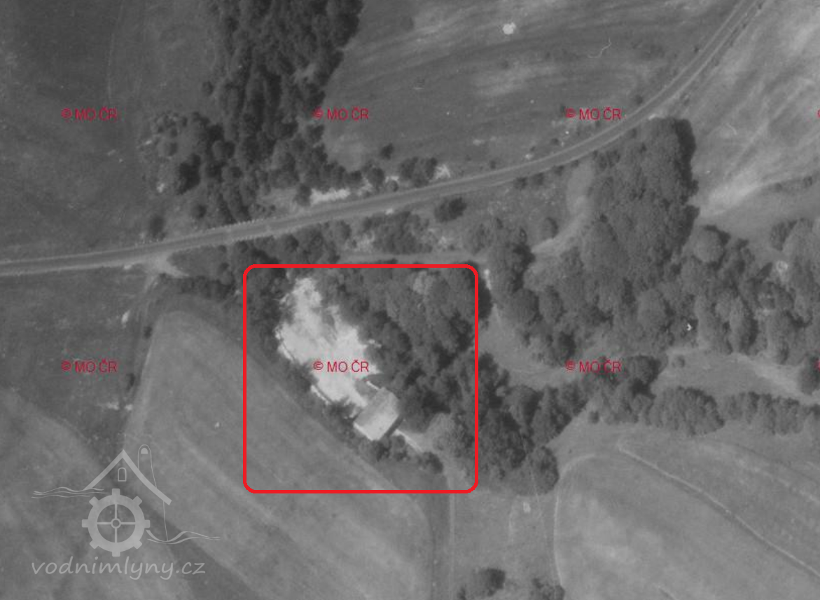 Mlýn na samotě, přestavěný na elektrárnu, zaniklý v 50. letech 20. stol.