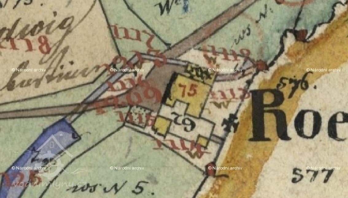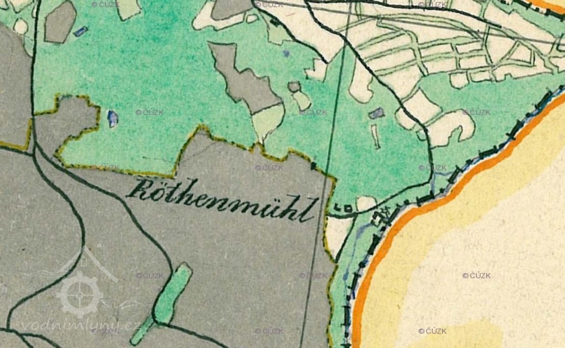 Obilní mlýn je už jmenován r.1640 v církevní matrice. Ležící na levém břehu potoku Röthenbach (Plesná) a nazvaný Röthenbach Mühle.