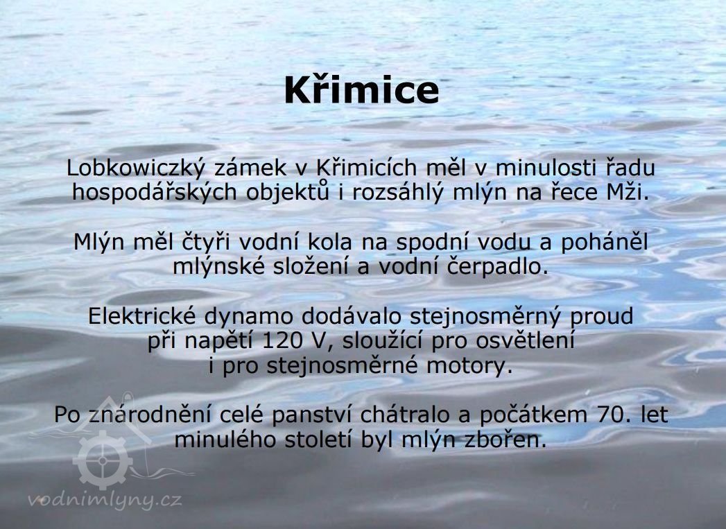 K roku 1930 byl křimický mlýn s elektrárnou vybavený jednou turbínou Girard o výkonu 33,8 HP. Po znárodnění chátral a počátkem sedmdesátých let 20. století byl zbořen. Dosud funkční poklopový jez byl v letech 1998–1999 opraven, stejný typ se nachází ještě na Ploučnici v České Lípě.