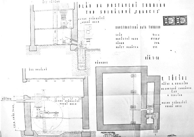 1939 firma Petr Petřík, Výroba mlýnských strojů-slévárna a stavba mlýnů v Táboře postavila turbínový domek
