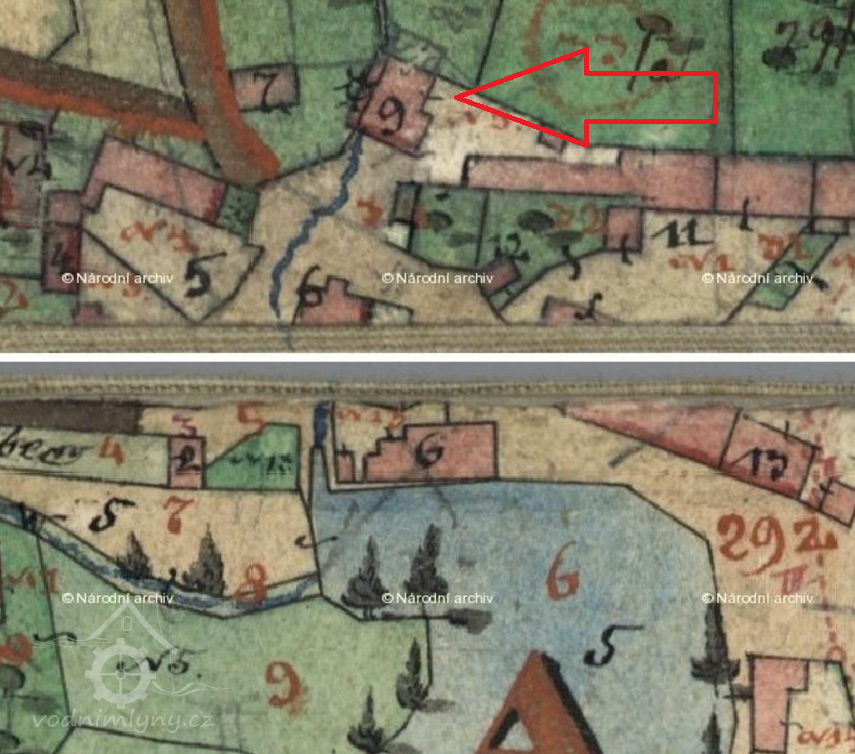 1909: "ku mlýnu přivádí se voda kanálem, který na dvoře mlýna přechází ve vantroky 20 cm široké, dřevěné a těmi vantroky na kolo s vrchní vodou...pohání se jedno složení české"