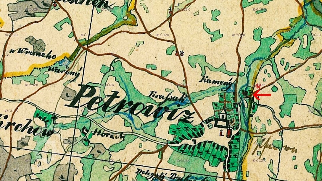 Starý, původně dřevěný mlýn pod Petrovicemi u panského Kamenného rybníka. Dnes zahrada s nepatrnou zástavbou.