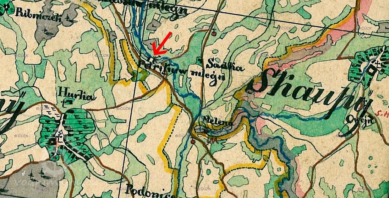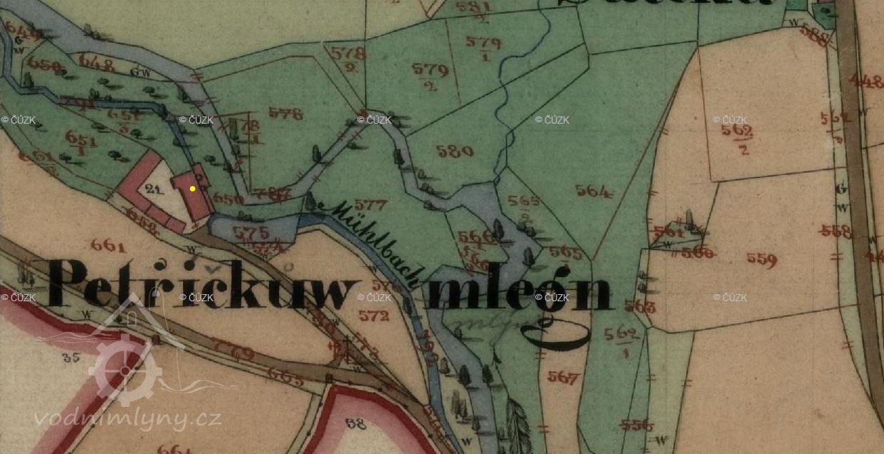 1654 Berní rula: mlynář Petříček, mlýn o 2 kolech, 18 strychů půdy, 1653 ale mlynář odešel a vrchnost mlýn pronajímá