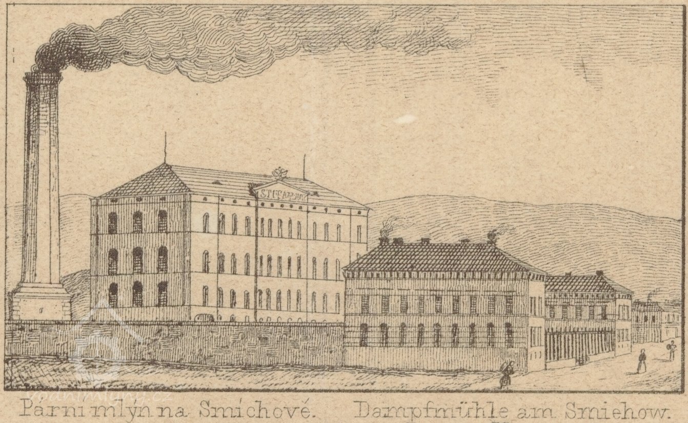 Smíchovský parní mlýn je dle soustavy od pana Sulzbergera vynalezené vystavěn, a předčí jiné parní mlýny znamenitou výhodou. Podařilo se mu odstraniti velikou vadu amerikánských mlýnů, totiž zahřátí mouky důmyslnou opravou válcových strojů. Mouka je pěknější a dá se déle držeti.