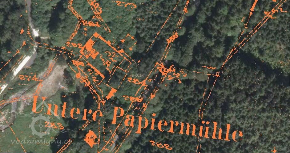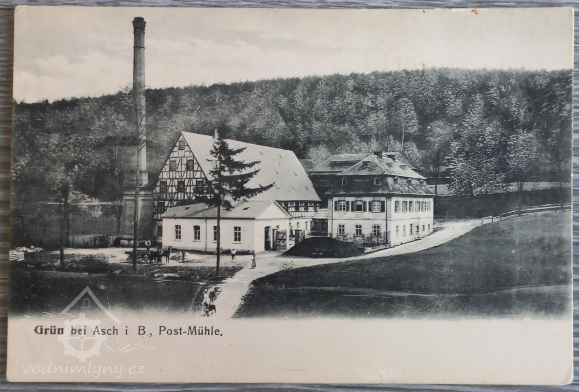 Vodní mlýn Wilhelm Lang č. 45 v Doubravě u Bílého Halštrova jménem "Postmühle".