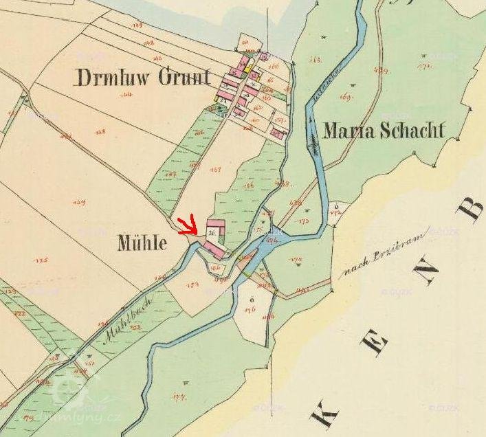 Začátkem 19. století - od roku 1804 - zde mlynařil Josef Drechsler, od roku 1817 Apolena Bartůňková a o rok později V. Drmla. Po něm zůstal název Drmlovo pole. To proto, že tento mlynář rozparceloval svá pole horníkům. Když roku 1837 V. Drmla zemřel, zdědil mlýn jeho syn Josef.