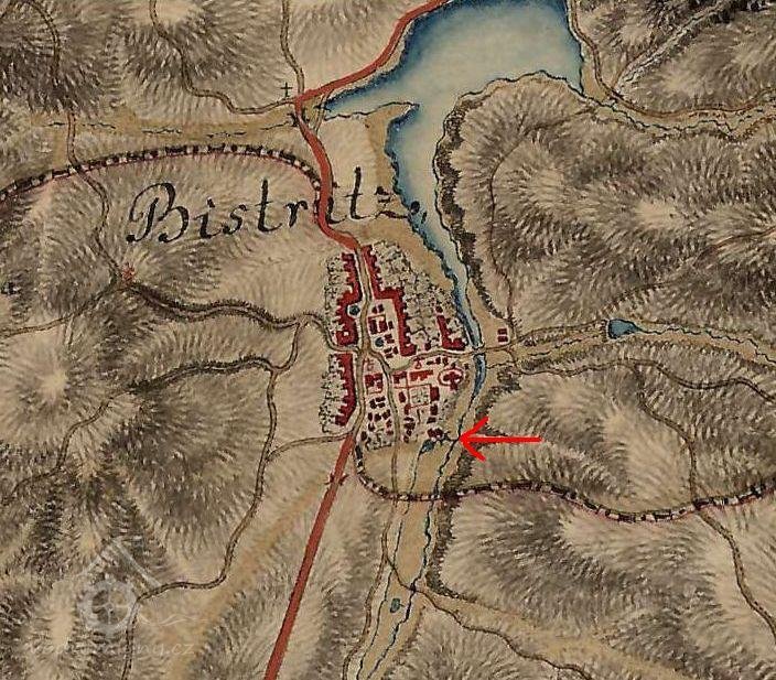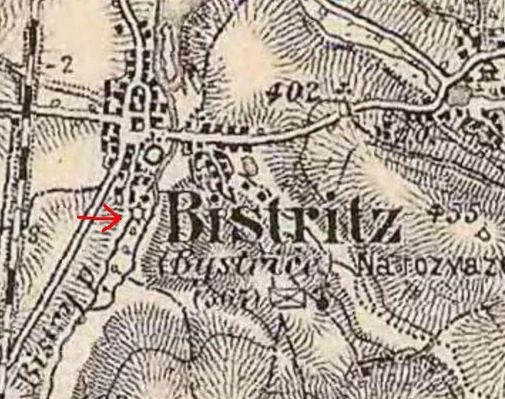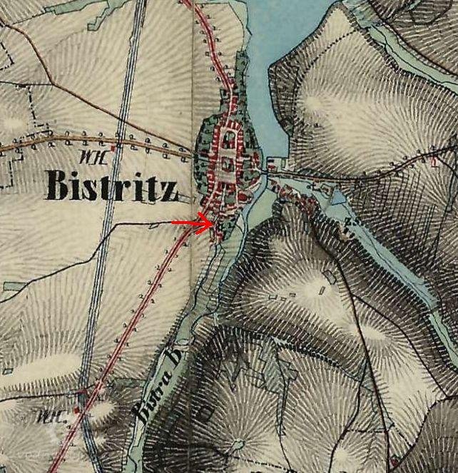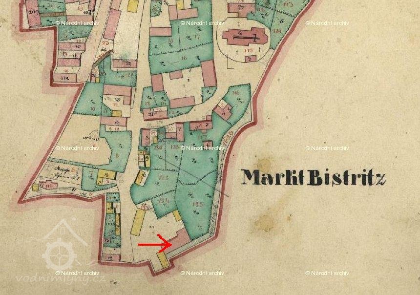 Mlýn stával na potoku Bystrém v Bystřici u Benešova. Pravděpodobně vznikl nejpozději v 18. století, protože je zakreslen už na I. vojenském mapování v letech 1764-68. Byl položen mezi obecní cestou a potokem. Vpředu u cesty byly hospodářské budovy, vzadu za dvorem stála přízemní mlýnská budova, za vantroky byla dřevěná kolna pily. Mlýnská budova se dělila na východní část obilního mlýna a západní část, kde bydlel mlynář.