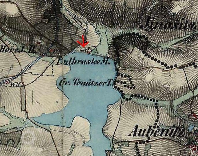 Mlýn byl postaven pod Podhrázským nebo také Velkým rybníkem v Tomicích ještě před I. vojenským mapováním /1764-68/. Indikační skica a císařský otisk z roku 1840 jej zobrazují jako velký zděný mlýn se dvěma vodními koly a s dalšími hospodářskými budovami. V roce 1840 byl majitelem mlýna čp.31 v Tomicích Josef Zimmerman.