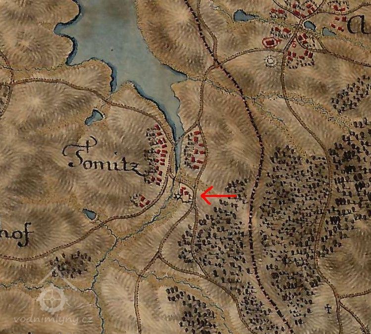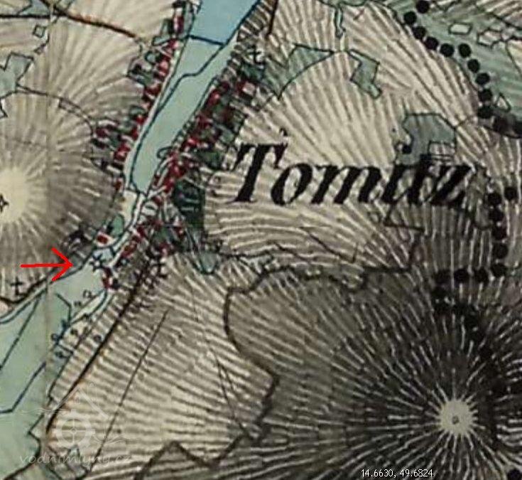 Mlýn na Konopišťském potoce v jižní části Tomic je zobrazen již na I. vojenském mapování v letech 1764-68.