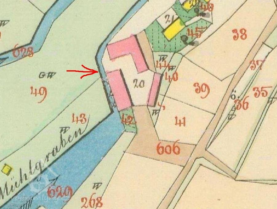Na císařském otisku a indikační skice v r. 1840 je vidět, že mlýn byl zděná budova o 3 vodních kolech a byly při něm další hospodářské budovy. V roce 1840 byl majitelem mlýna Antonín Zimmermann.