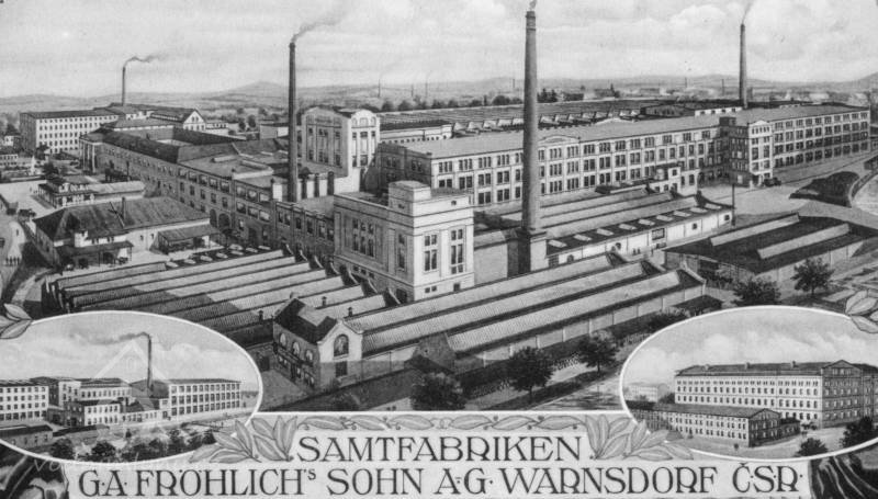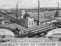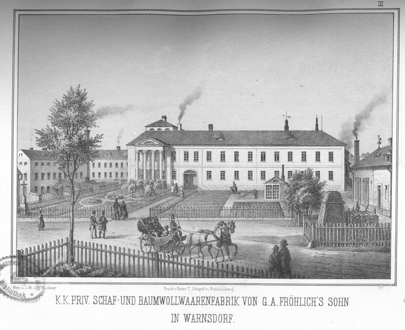 Vznik firmy je datován rokem 1777, kdy tkadlec Anton Fröhlich nakupuje větší množství tkalcovských stavů a začíná (v dnes již neexistujícím domě čp. 487) s výrobou lněného zboží, a po ukončení blokády na dovoz anglických přízí, také zboží bavlněného. Od roku 1787 vyvíjí technologii výroby kordů, manšestru a také nejnáročnější tkaniny – sametu. Budou tvořit základ výroby i po znárodnění továrny roku 1946 a pozdějšího n. p. Velveta. Z roku 1810 pochází klasicistní obytná a kancelářská budova čp. 3075, postavená kolem čtvercového dvora, později doplněná vysokým portikem a dnes památkově chráněná. Po roce 1813 fi rmu vedou Johan Reinhold a Carl Georg Fröhlich jako J. G. Fröhlich’s Söhne, s císařským privilegiem. První parní stroj o výkonu 5 HP instalují již roku 1835, roku 1862 byl uveden do provozu další, o výkonu 60 HP, v mechanické tkalcovně, roku 1871 je hotova budova barevny, přemosťující náhon. Další rozšíření, zejména budovu tkalcovny, provádí po roce 1880 stavitel Hanke. Od počátku k továrně patřily také původně oddělené budovy přes ulici (čp. 499), stavba na ulici kolmá byla označována jako mlýn, novější podélná sloužila jako skladiště a dílny. Dne 31. října roku 1914 zasáhl továrnu rozsáhlý požár, do léta 1915 byla postavena moderní čtyřpodlažní tkalcovna, barevna a tiskárna v pozdně secesním stylu, se železobetonovými stropy od firmy Ed. Ast & Co., navržená kanceláří Schmidt & Röttig. Tato největší budova celého areálu byla z velké části roku 2007 zbořena, aby uvolnila místo supermarketu – zachována zůstává sprinklerová věž.