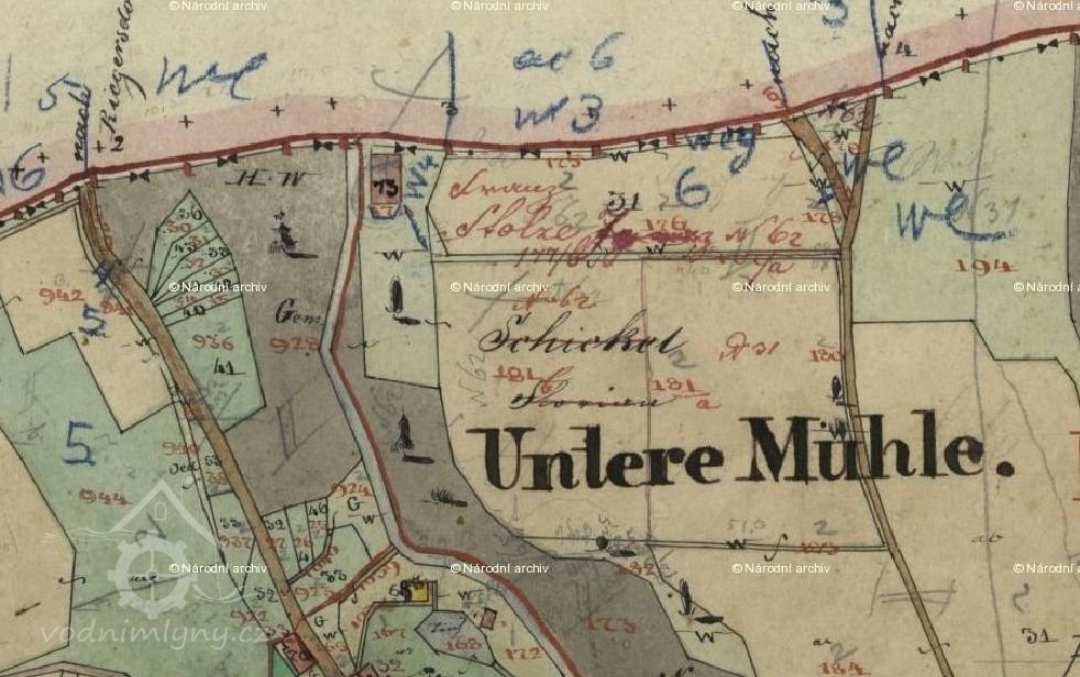 V roce 1845 postavil na Červeném potoce v údolí na samém severním okraji katastru obce Čermná Florian Schickel z čp. 31 nový mlýn, který měl čp. 62. Náklady na stavbu činily 3 095 florenů a 40 krejcarů.