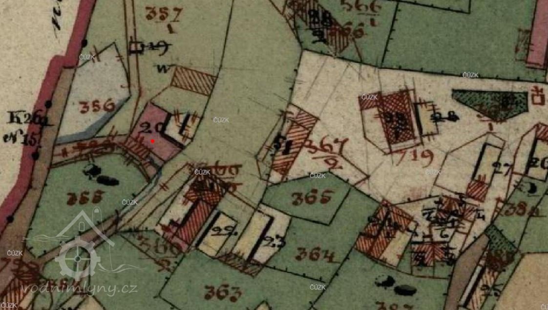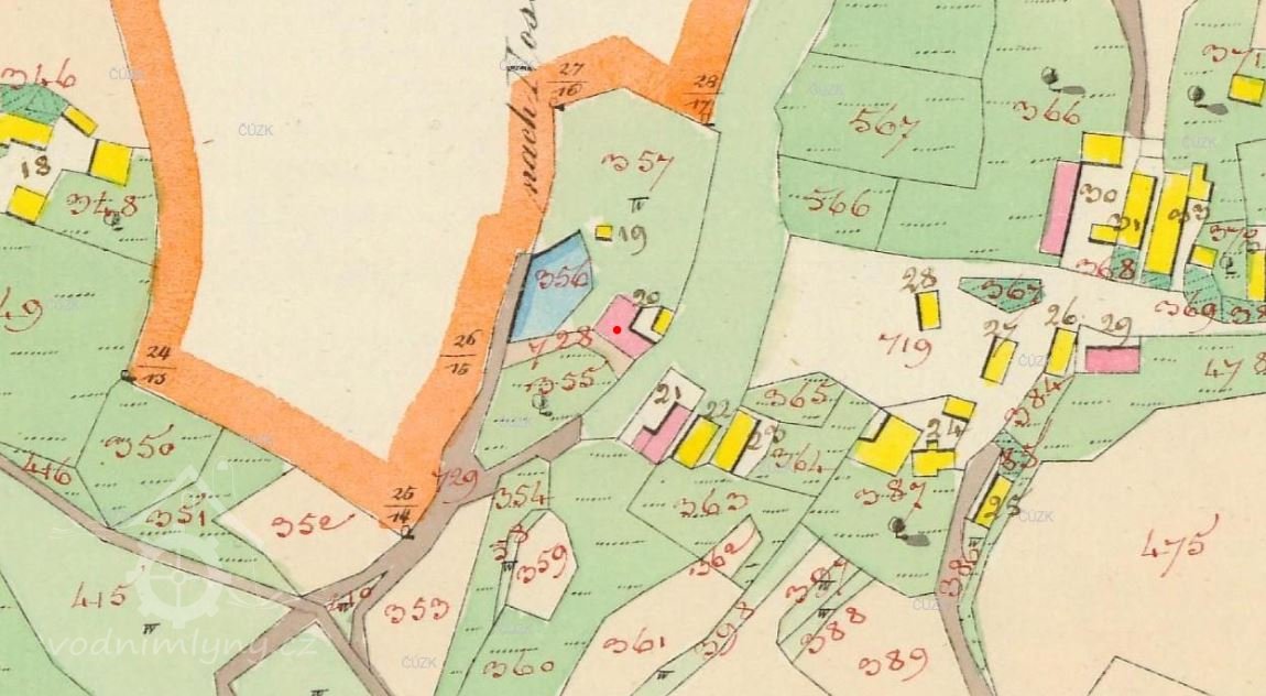Užívání vody k provozování mlynářské živnosti. V roce 1880 zasazeno normální znamení... Z nádržky přivádí se voda dřevěnou troubou 0,24 m širokou, stavidkem v nádržce uzavřenou, na jediné mlýnské kolo, které má 4,74 m výšky a 0,65 m šířky...