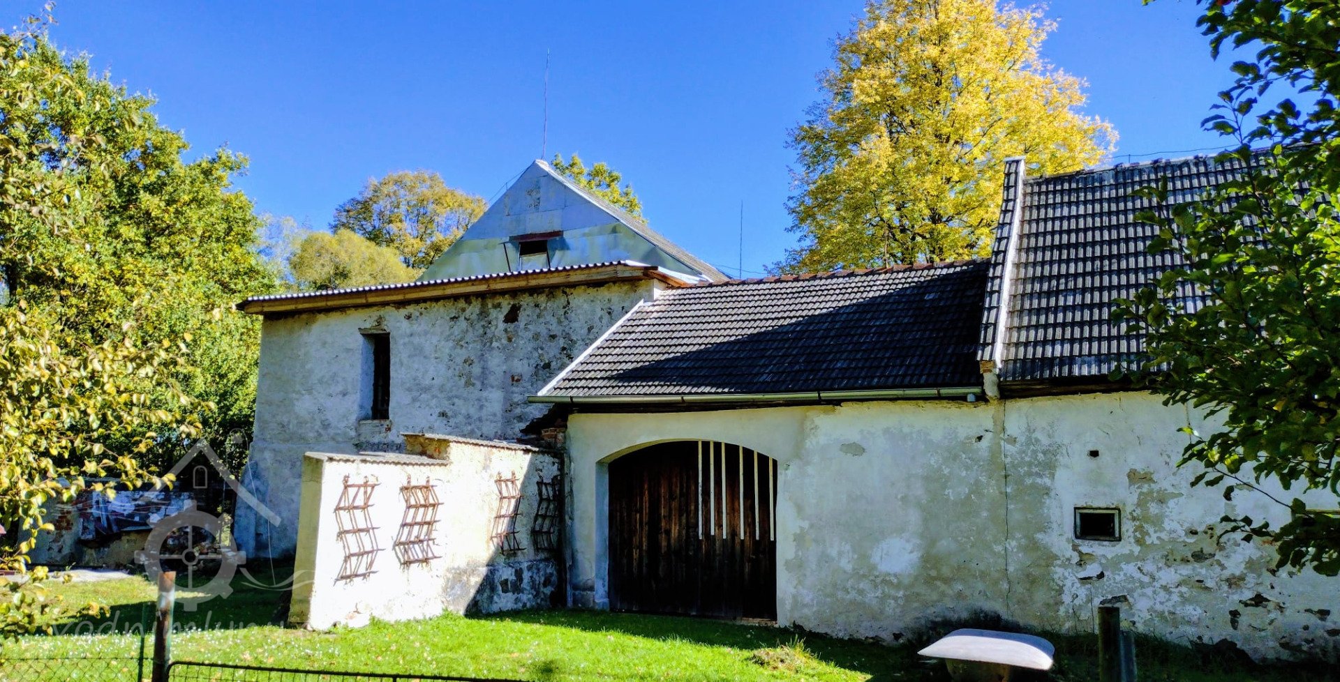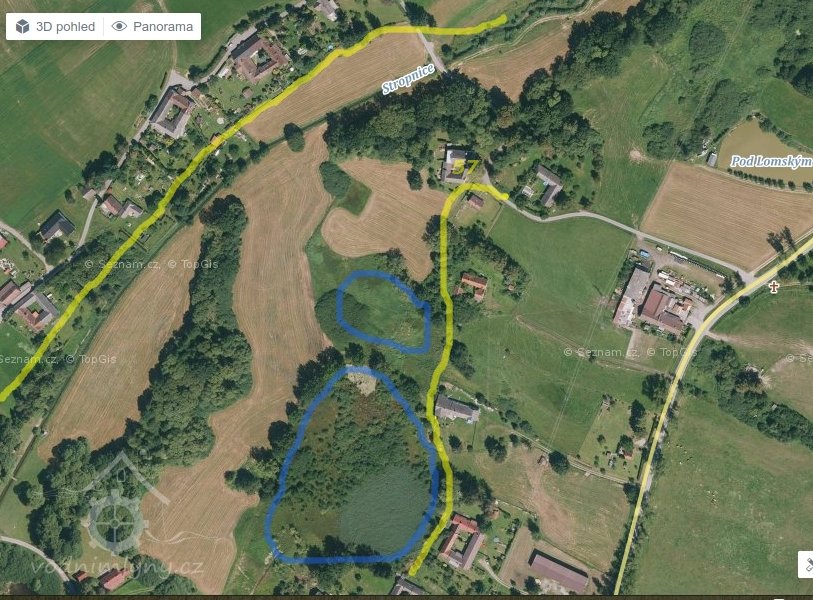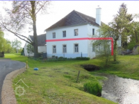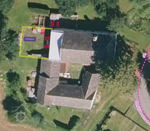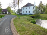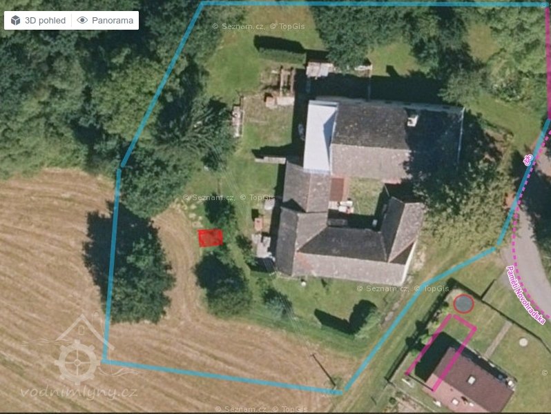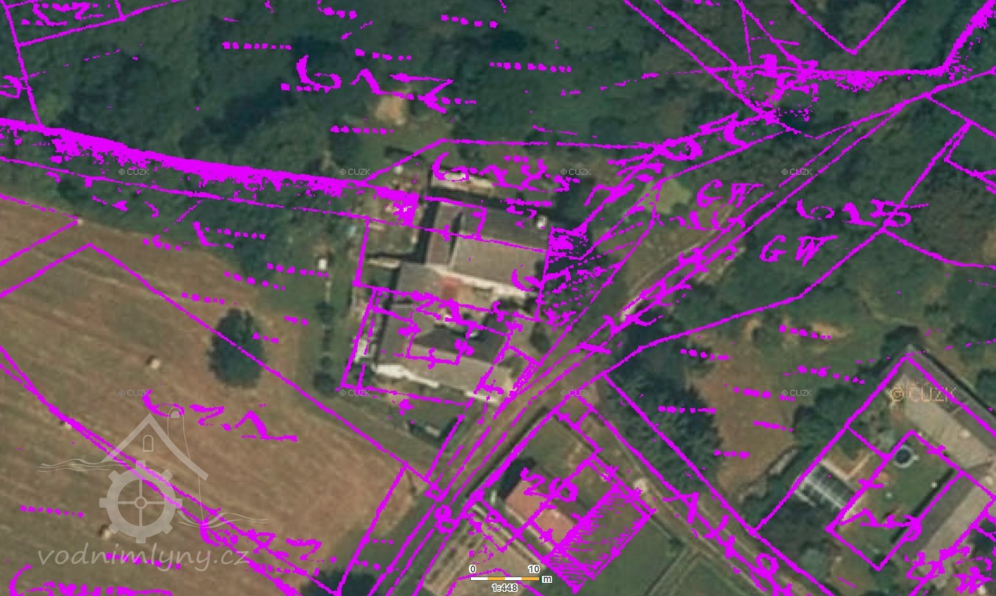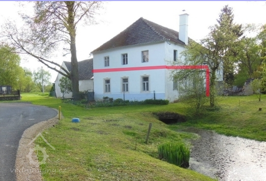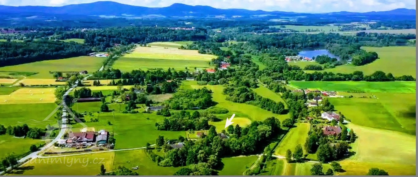 TECHNICKÁ POZNÁMKA BUDOUCÍM MAJITELUM: na snímku z r. 2010 jsou vidět maximální možné záplavy při extrémních úhrnech srážek. Do domu ani na dvůr či zahradu za stodolou voda nikdy nevnikne, ale pozemky vpravo (stojí-li člověk čelem k domu) pod vodou budou. Příčina je tato. Nový most na zregulované Stropnici tvořený třemi železobetonovými prefabrikáty se čtvercovou dutinou nemá dostatečnou propustnost. Takovéto díly by tam musely být min. 4, aby větší voda stačila odtékat. Bohužel nejsou. Most tedy během povodní, při dlouho trvajících přívalových deštích, neobvykle silných oblevách apod. (četnost zhruba 1x za 10 let) zafunguje jako částečná hráz či zátka, řeka se vylije z břehů a zaplaví okolní louky i pozemky v blízkosti mlýna. To by samo o sobě nevadilo, pokud by byl býval zůstal zachován původní most přes staré přirozené říční koryto nacházející se na konci odtokového kanálu mlýna. Na začátku a konci "starého" mostu rostou po každé straně cesty lípy. Pod povrchem vozovky (asfaltem) jsou panely uložené na podélně s vozovkou orientovaných ocelových traverzách, které jsou upevněny na betonových základech (u těch lip). Toto byl původní most schopný unést dokonce i kombajny a jinou těžkou techniku. Po zrušení řeky bylo koryto zasypáno a úbočí mostu vysypána štěrkem. Přepadová roura z náhonu resp. odtokového kanálu jdoucí skrze zásyp na druhou stranu mostu má jednak nedostatečný průměr i je příliš vysoko nad hladinou. Celý problém s potenciálními záplavami by se celkem snadno vyřešil proražením díry pod tímto dnes již neexistujícím mostem a položením roury (nebo více rour) s výrazně větším průměrem. Toto řešení by nebylo technicky náročné (při troše snahy by se vozovka nemusela rozkopat) ani nákladné.