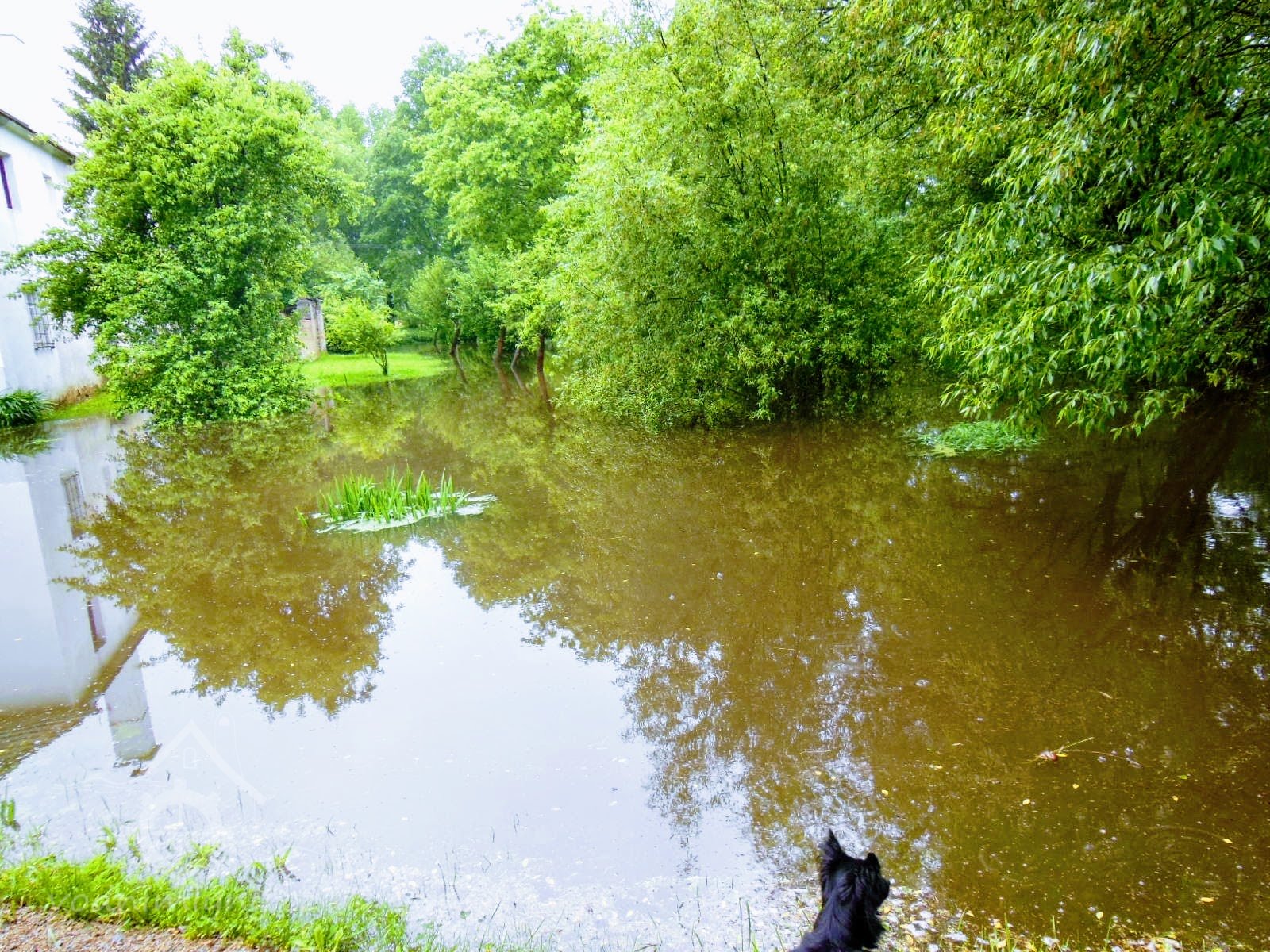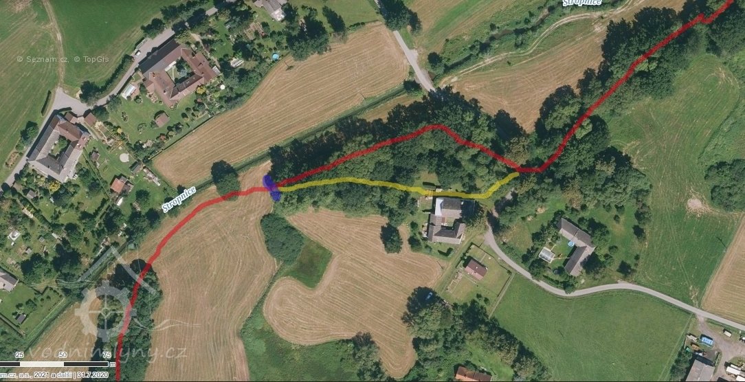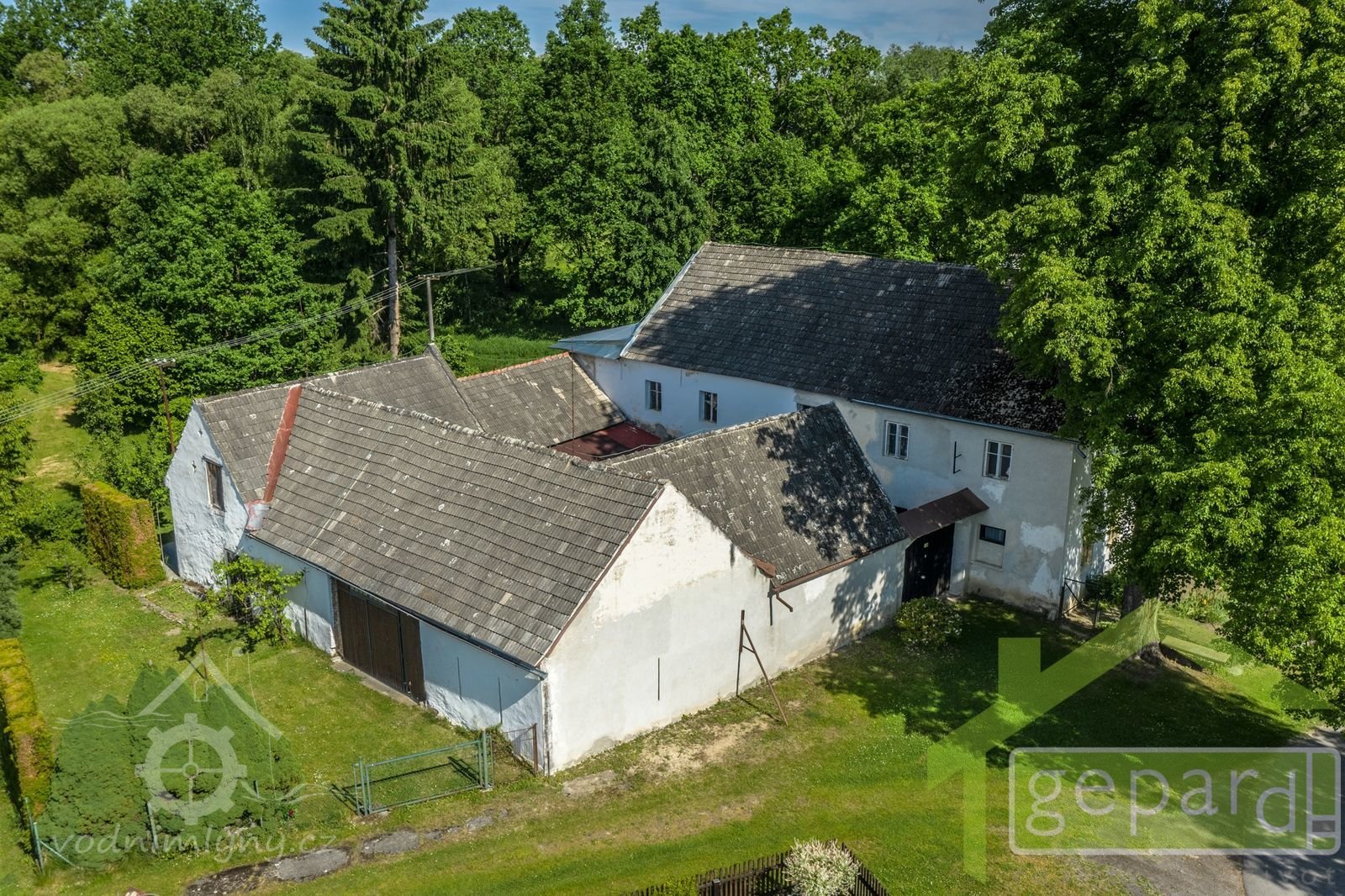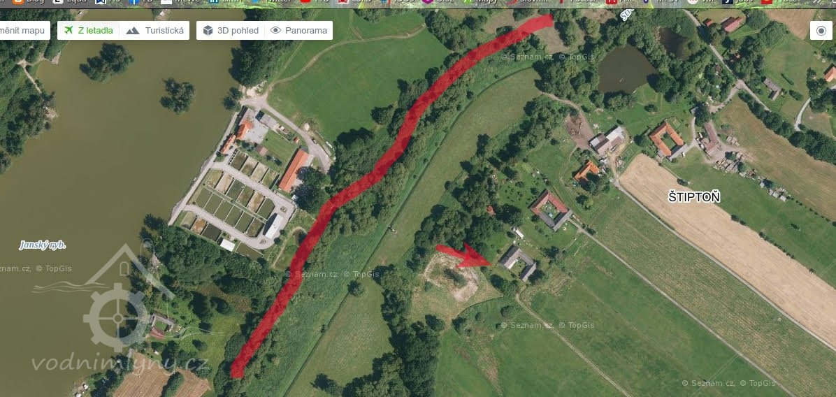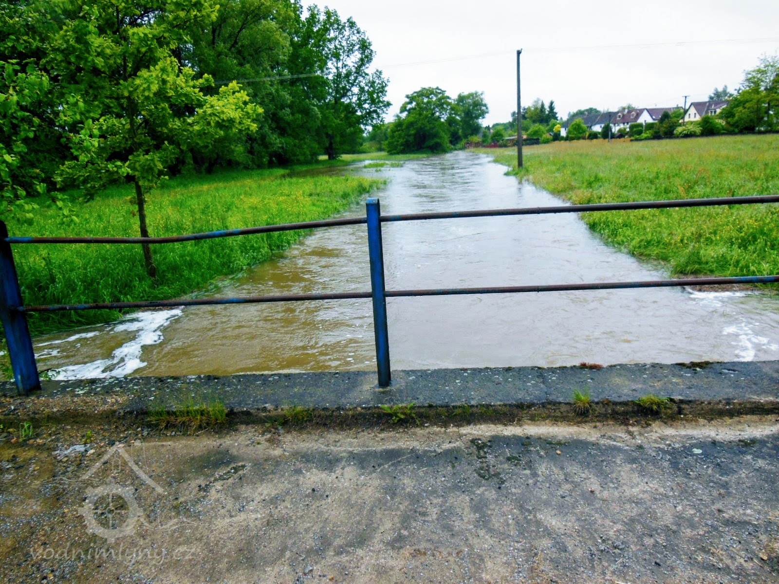 TECHNICKÁ POZNÁMKA BUDOUCÍM MAJITELUM: na snímku z r. 2010 jsou vidět maximální možné záplavy při extrémních úhrnech srážek. Do domu ani na dvůr či zahradu za stodolou voda nikdy nevnikne, ale pozemky vpravo (stojí-li člověk čelem k domu) pod vodou budou. Příčina je tato. Nový most na zregulované Stropnici tvořený třemi železobetonovými prefabrikáty se čtvercovou dutinou nemá dostatečnou propustnost. Takovéto díly by tam musely být min. 4, aby větší voda stačila odtékat. Bohužel nejsou. Most tedy během povodní, při dlouho trvajících přívalových deštích, neobvykle silných oblevách apod. (četnost zhruba 1x za 10 let) zafunguje jako částečná hráz či zátka, řeka se vylije z břehů a zaplaví okolní louky i pozemky v blízkosti mlýna. To by samo o sobě nevadilo, pokud by byl býval zůstal zachován původní most přes staré přirozené říční koryto nacházející se na konci odtokového kanálu mlýna. Na začátku a konci "starého" mostu rostou po každé straně cesty lípy. Pod povrchem vozovky (asfaltem) jsou panely uložené na podélně s vozovkou orientovaných ocelových traverzách, které jsou upevněny na betonových základech (u těch lip). Toto byl původní most schopný unést dokonce i kombajny a jinou těžkou techniku. Po zrušení řeky bylo koryto zasypáno a úbočí mostu vysypána štěrkem. Přepadová roura z náhonu resp. odtokového kanálu jdoucí skrze zásyp na druhou stranu mostu má jednak nedostatečný průměr i je příliš vysoko nad hladinou. Celý problém s potenciálními záplavami by se celkem snadno vyřešil proražením díry pod tímto dnes již neexistujícím mostem a položením roury (nebo více rour) s výrazně větším průměrem. Toto řešení by nebylo technicky náročné (při troše snahy by se vozovka nemusela rozkopat) ani nákladné.