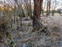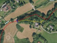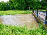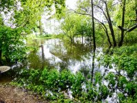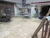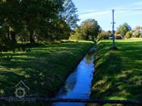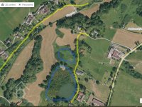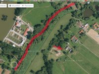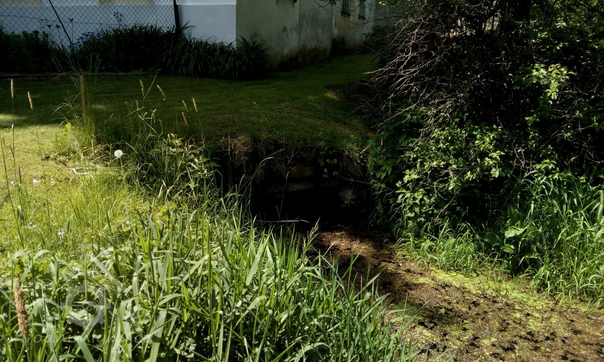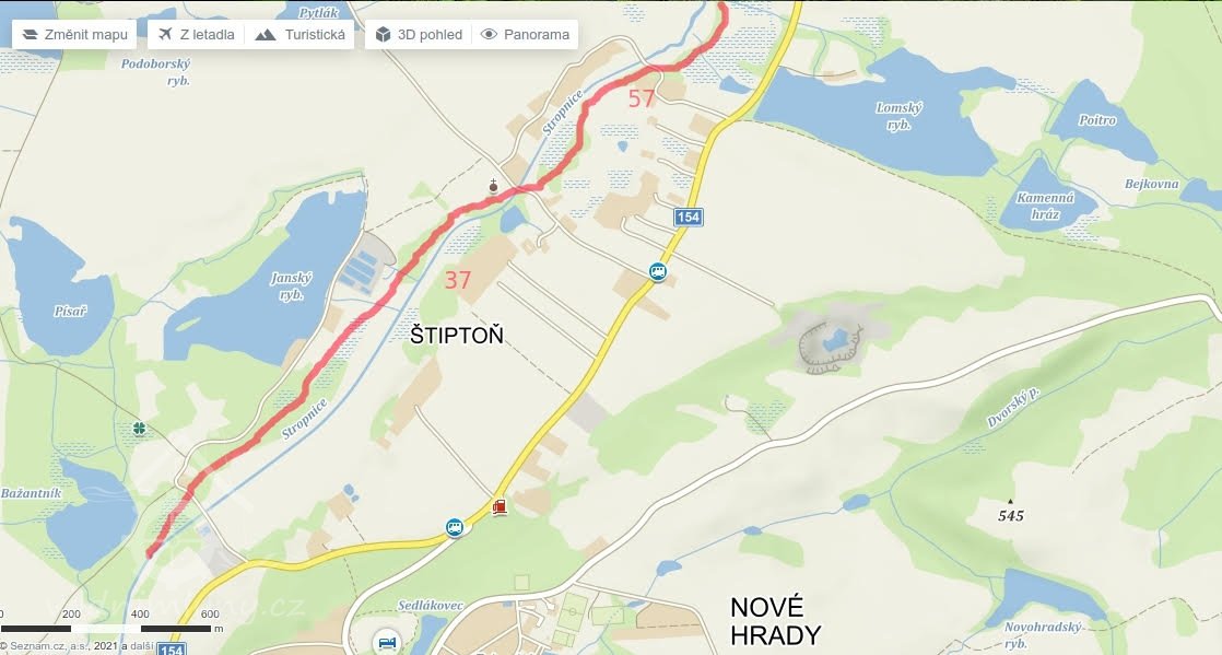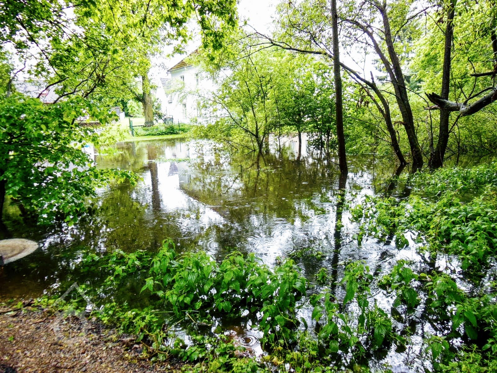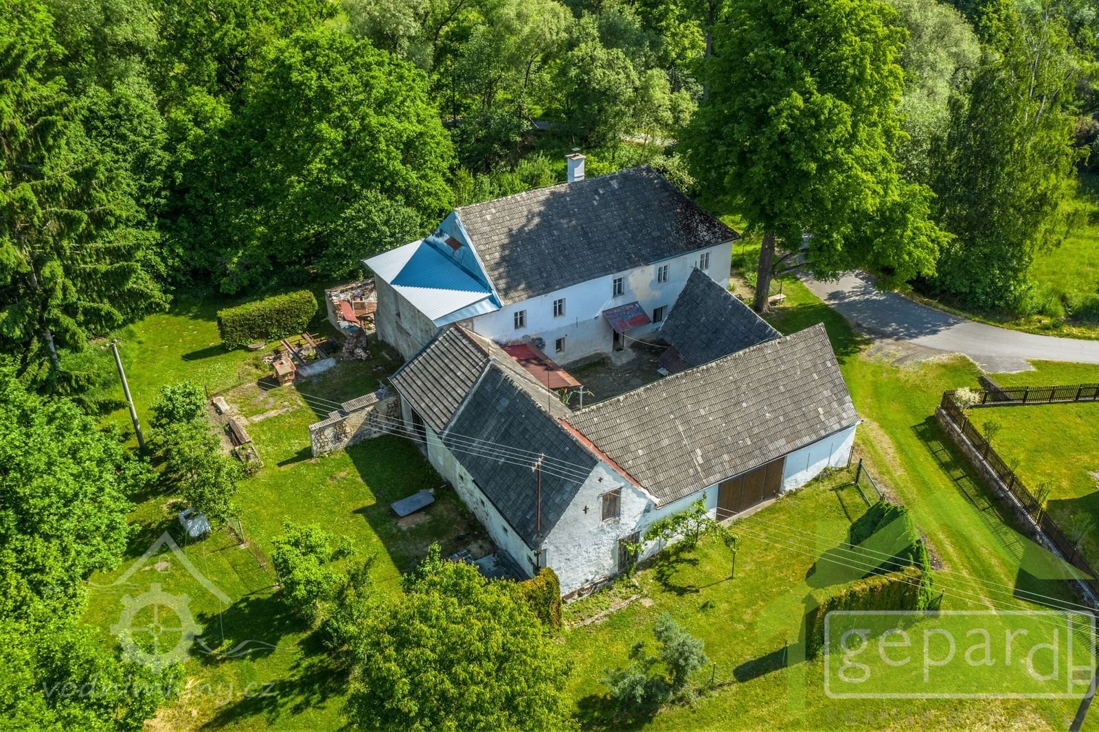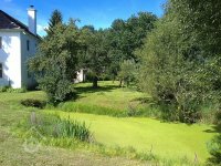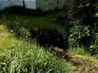 TECHNICKÁ POZNÁMKA BUDOUCÍM MAJITELUM: na snímku z r. 2010 jsou vidět maximální možné záplavy při extrémních úhrnech srážek. Do domu ani na dvůr či zahradu za stodolou voda nikdy nevnikne, ale pozemky vpravo (stojí-li člověk čelem k domu) pod vodou budou. Příčina je tato. Nový most na zregulované Stropnici tvořený třemi železobetonovými prefabrikáty se čtvercovou dutinou nemá dostatečnou propustnost. Takovéto díly by tam musely být min. 4, aby větší voda stačila odtékat. Bohužel nejsou. Most tedy během povodní, při dlouho trvajících přívalových deštích, neobvykle silných oblevách apod. (četnost zhruba 1x za 10 let) zafunguje jako částečná hráz či zátka, řeka se vylije z břehů a zaplaví okolní louky i pozemky v blízkosti mlýna. To by samo o sobě nevadilo, pokud by byl býval zůstal zachován původní most přes staré přirozené říční koryto nacházející se na konci odtokového kanálu mlýna. Na začátku a konci "starého" mostu rostou po každé straně cesty lípy. Pod povrchem vozovky (asfaltem) jsou panely uložené na podélně s vozovkou orientovaných ocelových traverzách, které jsou upevněny na betonových základech (u těch lip). Toto byl původní most schopný unést dokonce i kombajny a jinou těžkou techniku. Po zrušení řeky bylo koryto zasypáno a úbočí mostu vysypána štěrkem. Přepadová roura z náhonu resp. odtokového kanálu jdoucí skrze zásyp na druhou stranu mostu má jednak nedostatečný průměr i je příliš vysoko nad hladinou. Celý problém s potenciálními záplavami by se celkem snadno vyřešil proražením díry pod tímto dnes již neexistujícím mostem a položením roury (nebo více rour) s výrazně větším průměrem. Toto řešení by nebylo technicky náročné (při troše snahy by se vozovka nemusela rozkopat) ani nákladné.