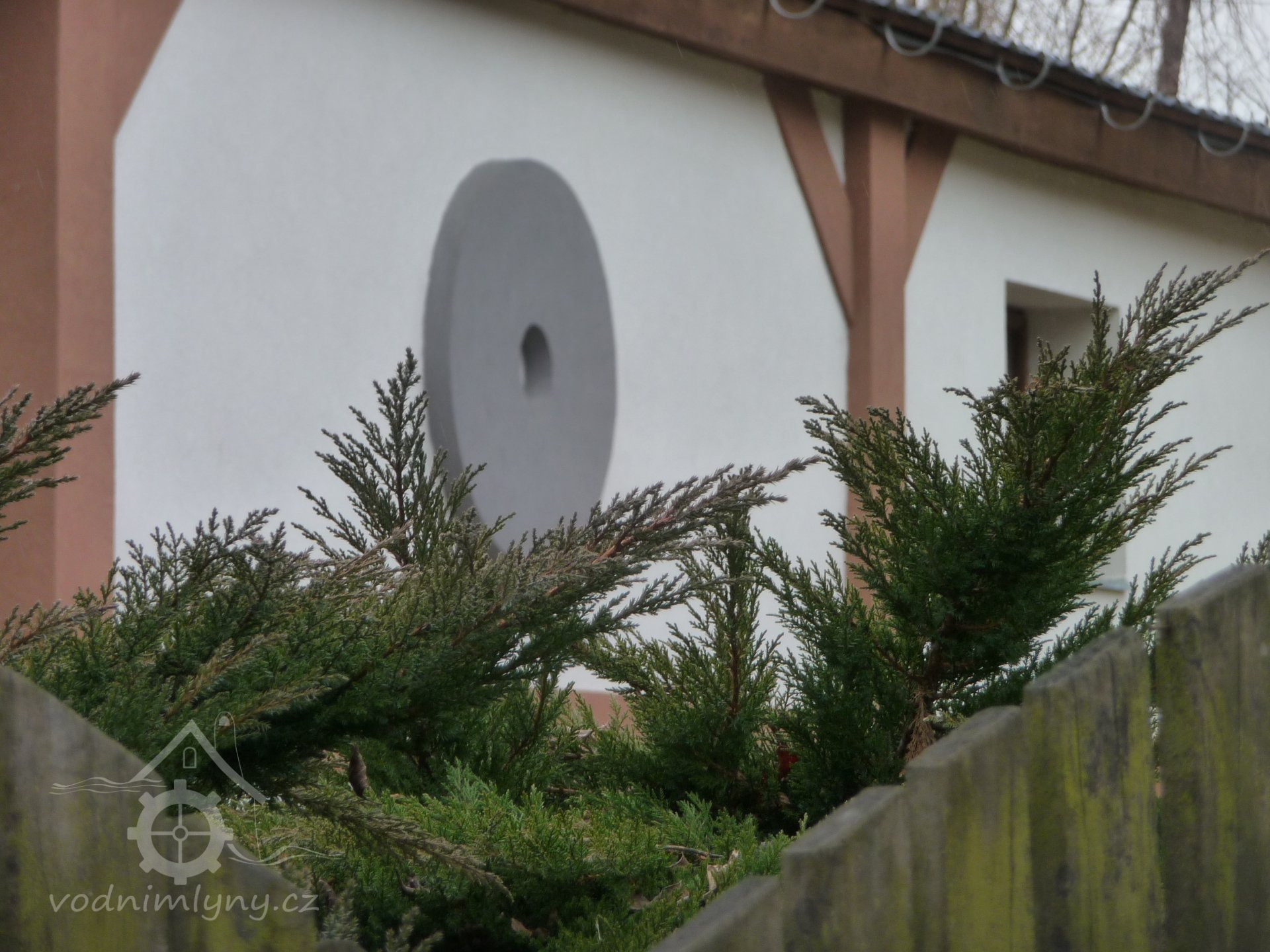 Na jedné zdi novostavby je symbol mlecího kamene.