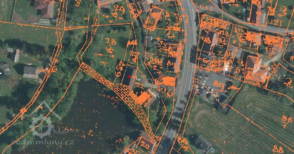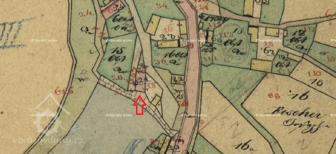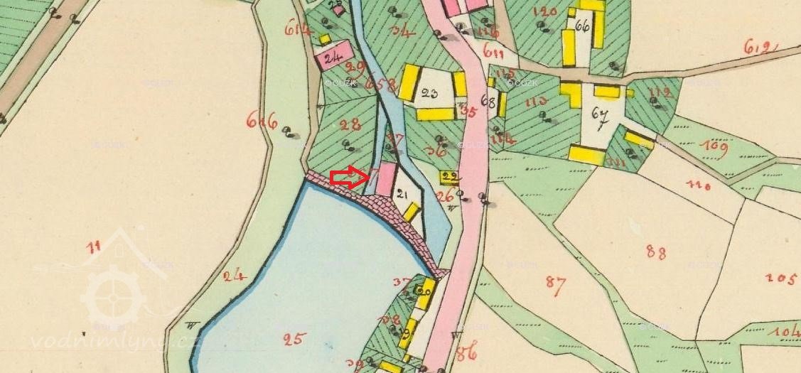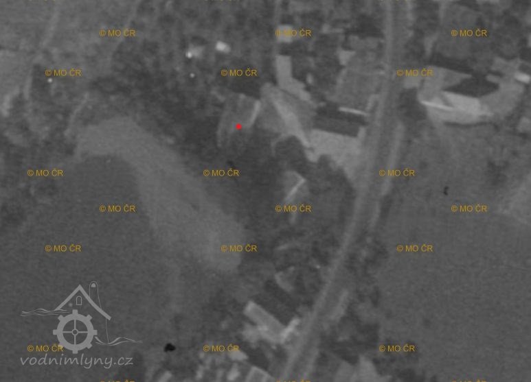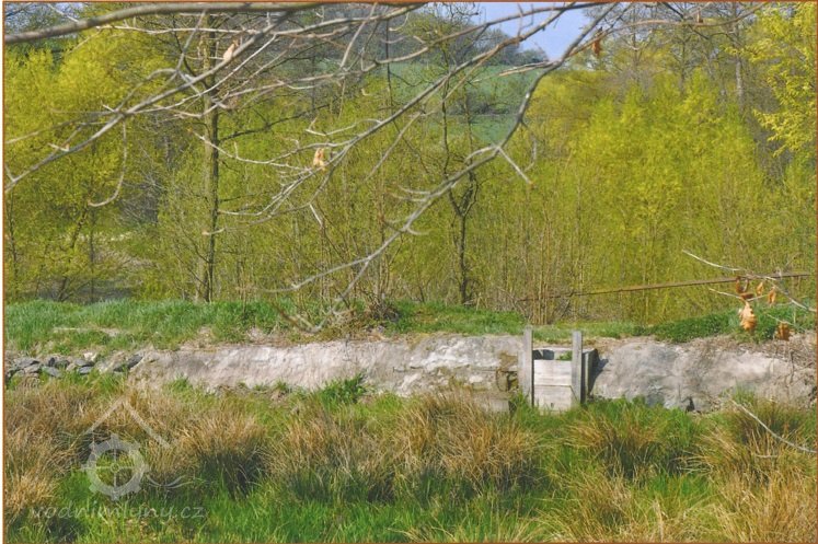 Mlýnský rybník nad mlýnem, z rybníka vedena voda vantroky na kolo
