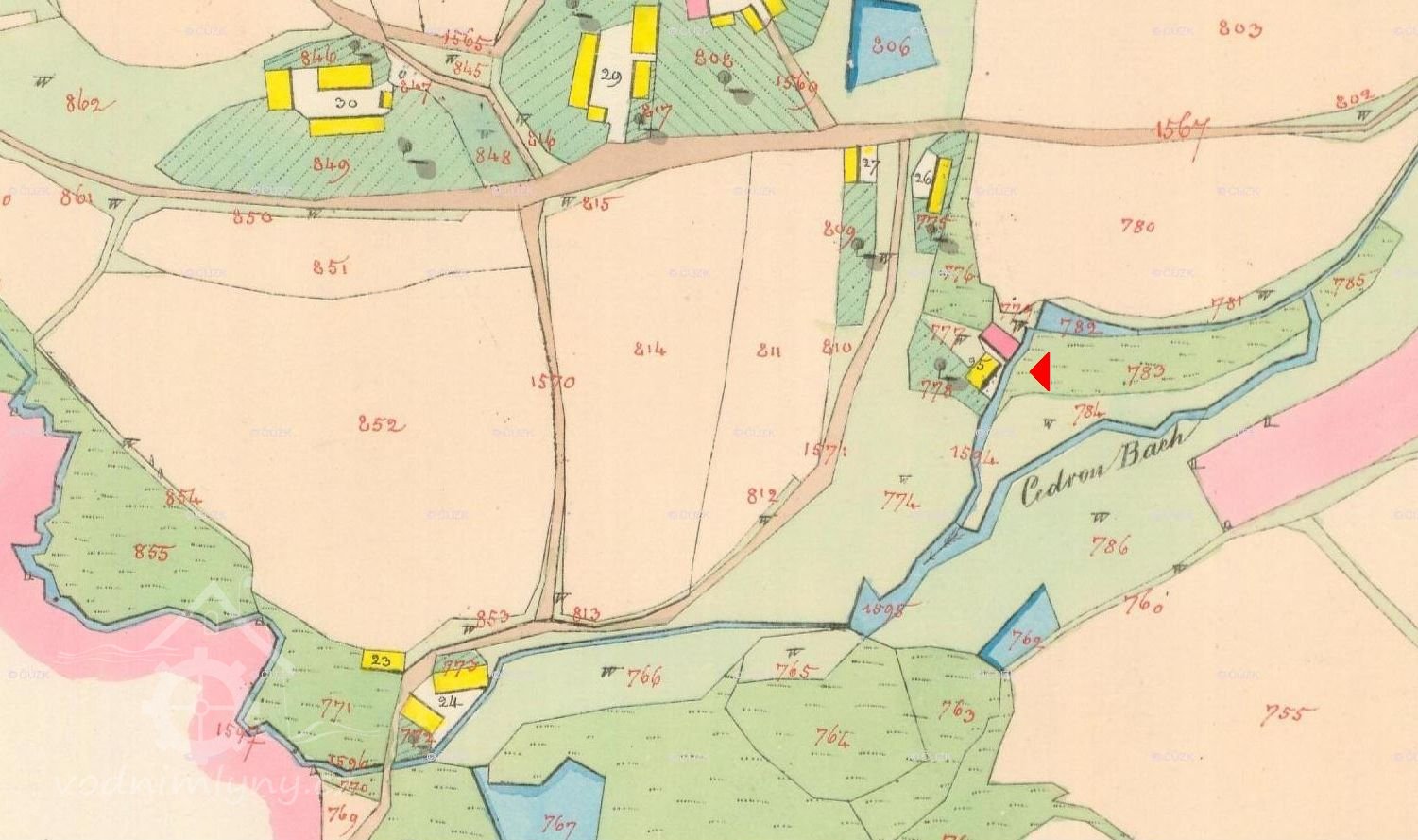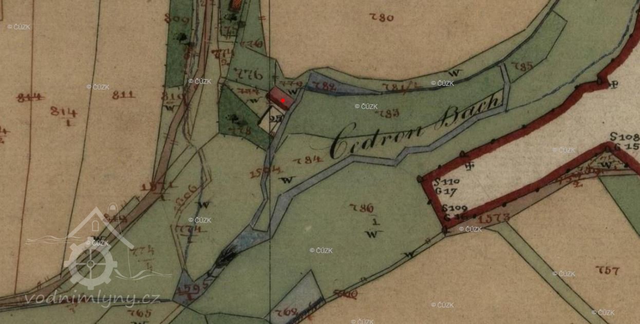 Voda přitékala do nádržky u mlýna náhonem od zájezdku na potoce Cedron. Voda vtékala z nádržky do vantrok dřevěnou troubou 0,38 m širokou přes stavidlo, které byla v nádržce Vantroky mlýnské byly u stavidel 0,75 m široké a 0,31 m vysoké. Otvorem kterým se přiváděla voda z vantrok na hořejší složení je 0,33 m široký, otvor pro dolejší složení je 0,31 m široký.