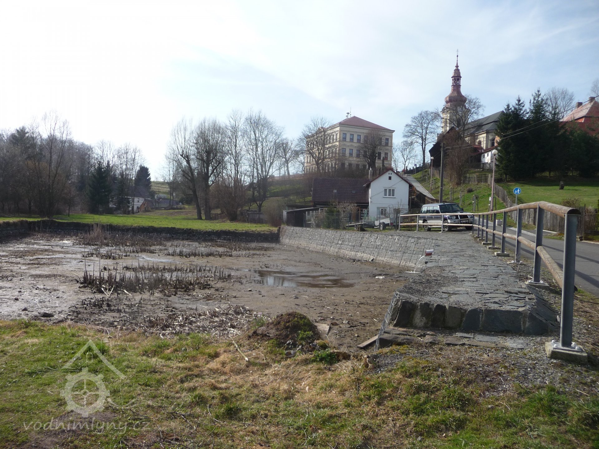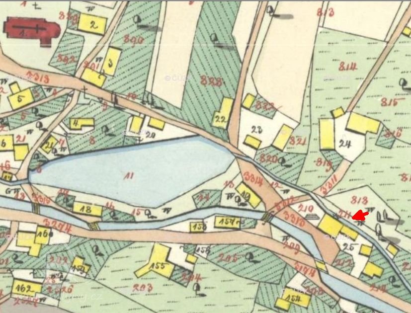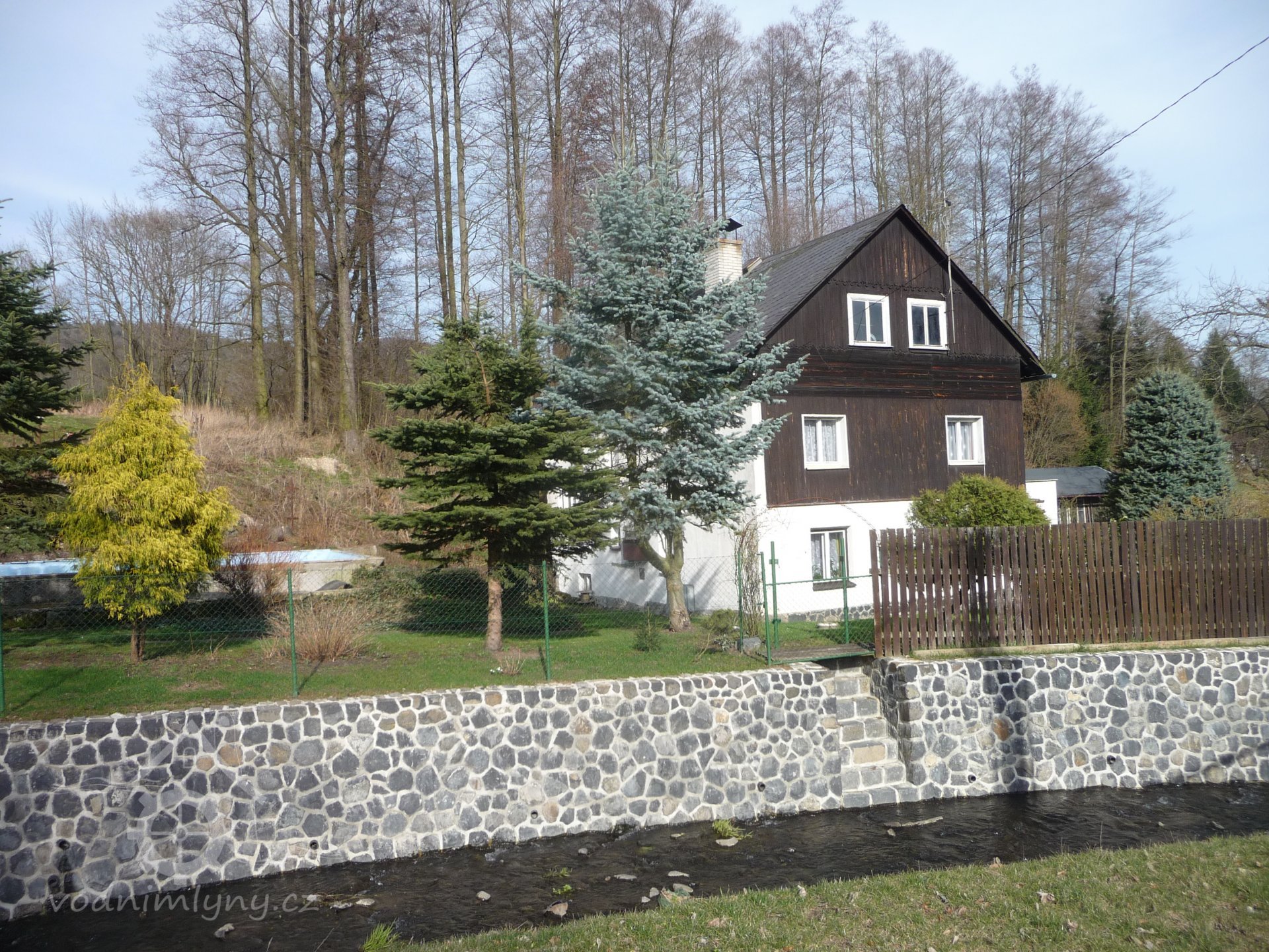 V zahradě mlýna je patrný zakrytý náhon, nad mlýnem mal rybníček - akumulační nádržka.