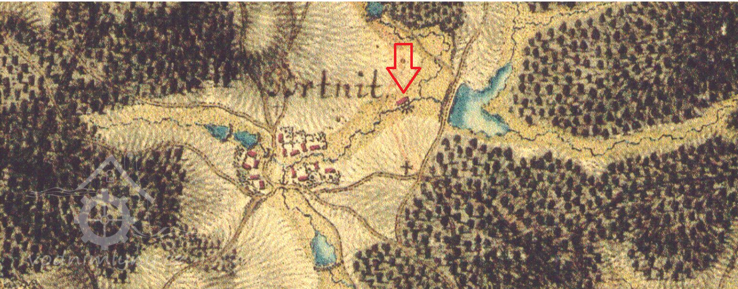 Mlýn v centru Brtnice. Dle I. vojenského mapování ležel původní brtnický mlýn východně od obce, vzhledem k tomu, že rybník a cesta se na pozdějších mapách již nevyskytují, není jej prozatím možno přesněji lokalizovat (nejedná-li se vůbec o omyl kartografa).