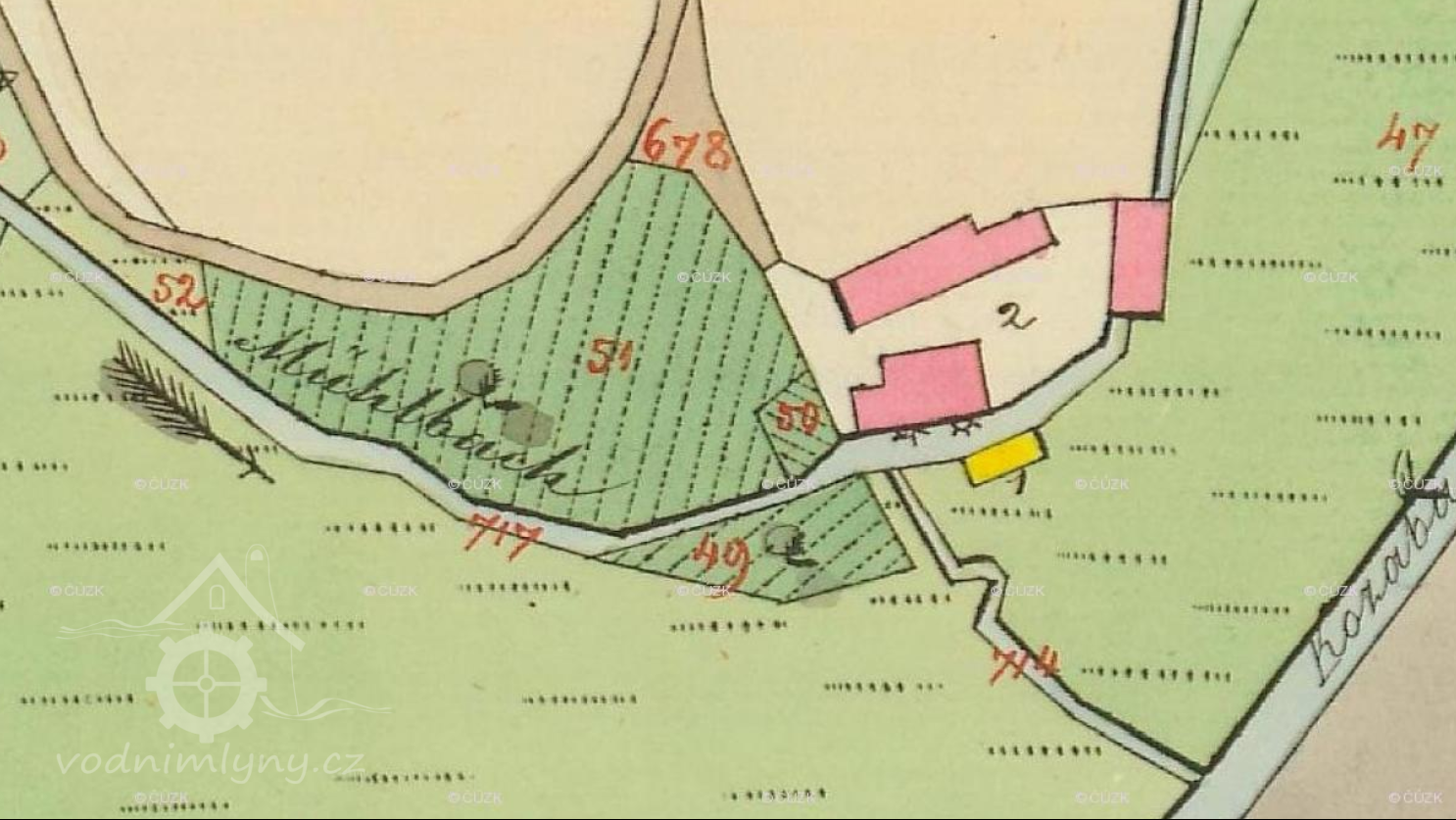 K mlýnu náleží mlýnice, obytné a hospodářské stavení s jednou pilou a  pozemky v celkové výměře 13 jiter a 59 a 5/6 sáhu.