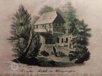 Původně malý mlýn, po roce 1900 přestavěný na fabričku na knoflíky, kolíčky na prádlo a podobné zboží se soustruhy, poháněnými vodní silou. Počátkem 60. let 20. stol. strojní zařízení přestěhováno na Slovensko a objekt přeměněn na obytný dům, přičemž byla proražena trojdílná okna, čímž mlýn získal vzhled přímo surreálný (jako kříženec mlýna s panelákem).