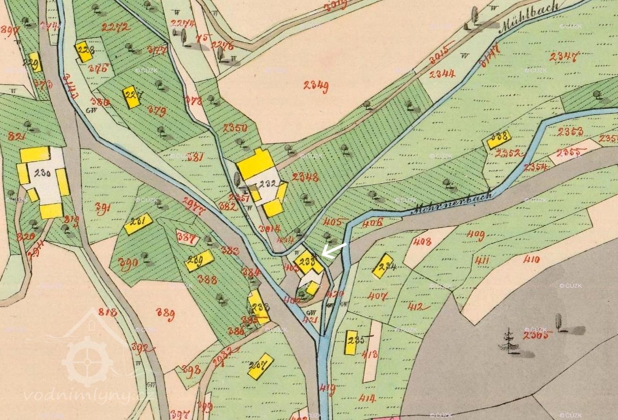 Popis1930: 1 kolo na svrchní vodu, hltnost 0,135 m3/s, spád 5,3 m, výkon 6,2 HP