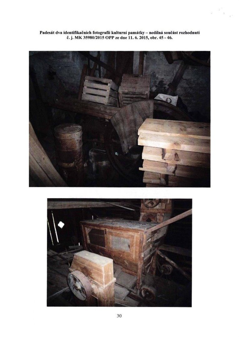 Dotčené původní technické vybavení se skládá z: palečného kola v přízemí mlýnice, dále z plnících otvorů kapsových výtahů (prochází celým objektem až k vysévací podlaze v podstřeší), z hlavní transmise a z pomocného dieselového motoru (produkt Akciové společnosti Strojírny Blansko, dříve Breitfeld - Daněk a spol.), dále v prostoru válcové (mlecí) podlahy ze zásobníků, násypek, válcové mlecí stolice, loupačky a ze dvou šrotovníků (kladívkového a válcového), dále v prostoru vysévací podlahy (podstřeší mlýnice) z vysévačů, čistících strojů, z hlavic kapsových výtahů a z transmise pro pohon jednotlivých součástí mlecího zařízení.
