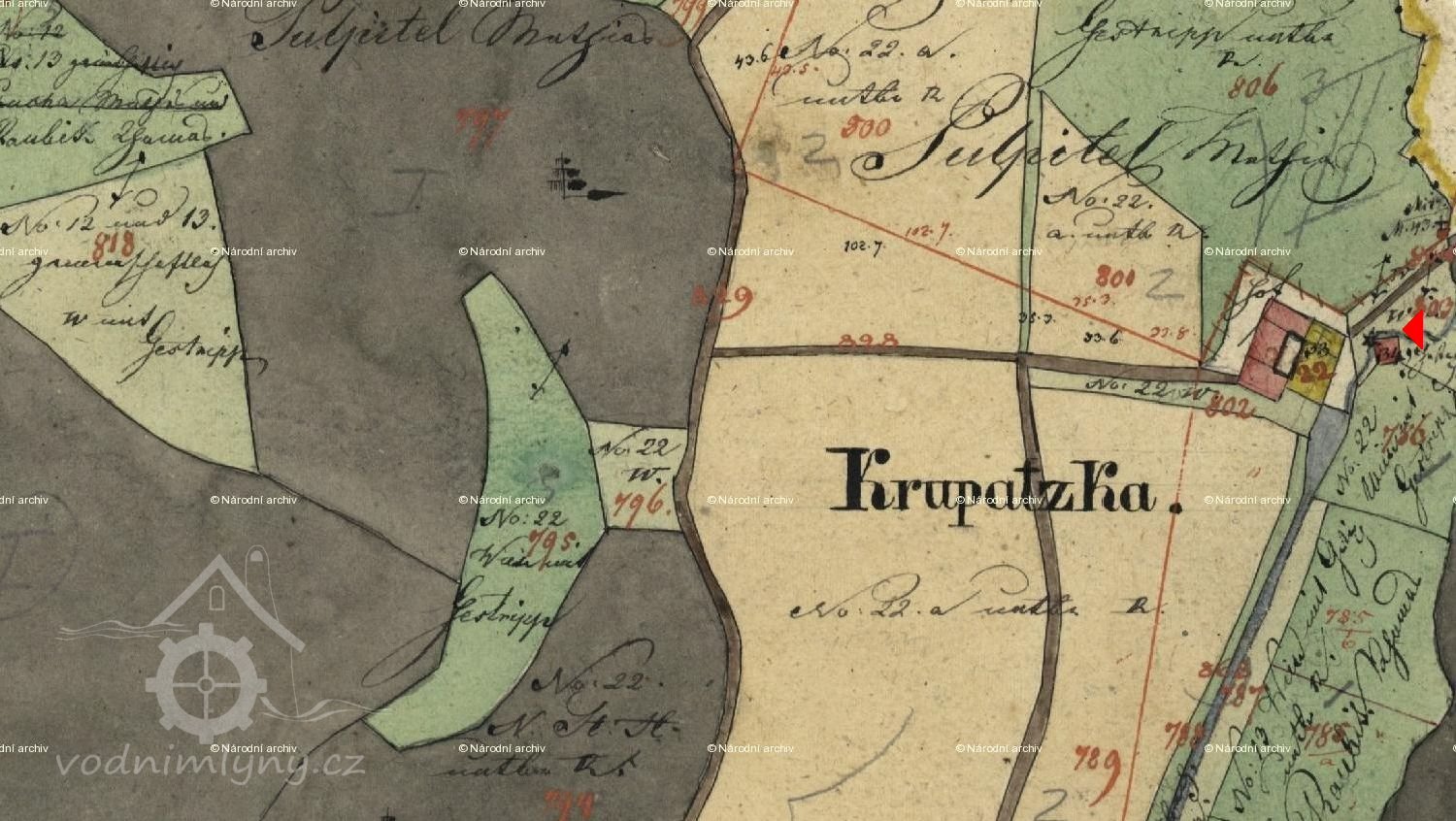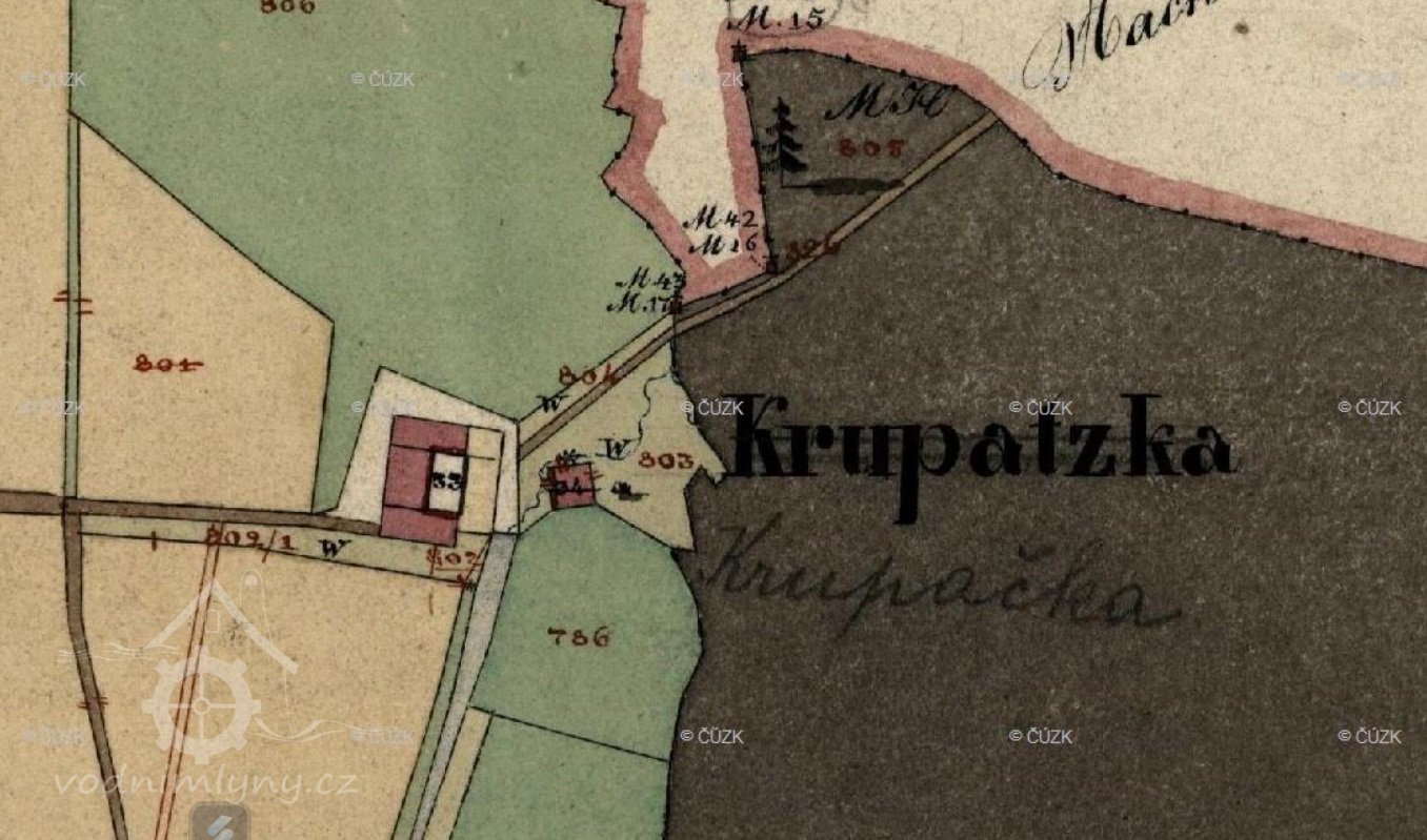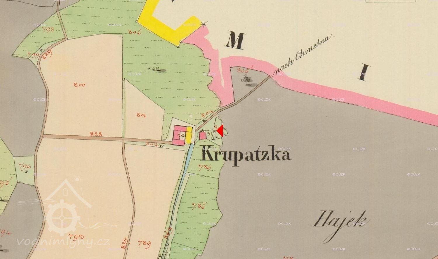 Potřebná voda táhne se z rybníka kulatou troubou položenou v levém (po vodě) cípu hráze o průměru 24 cm se stavítkem do mlýnské strouhy. Ze strouhy jde voda do vantrok. Vantroky jsou 3 m dlouhé, 64 cm hluboké, střední šířka 58 cm. Na vantroky připojují se dva žlaby ke dvěma vodním kolům. Žlab na horní kolo jest 2,3 m dlouhý, 32 cm hluboký 32 cm široký, žlab na dolní kolo jest 7 m dlouhý, 16 cm hluboký a 18 cm široký. Odpadávající voda od strojů se spojuje pod mlýnem s jalovým potokem.