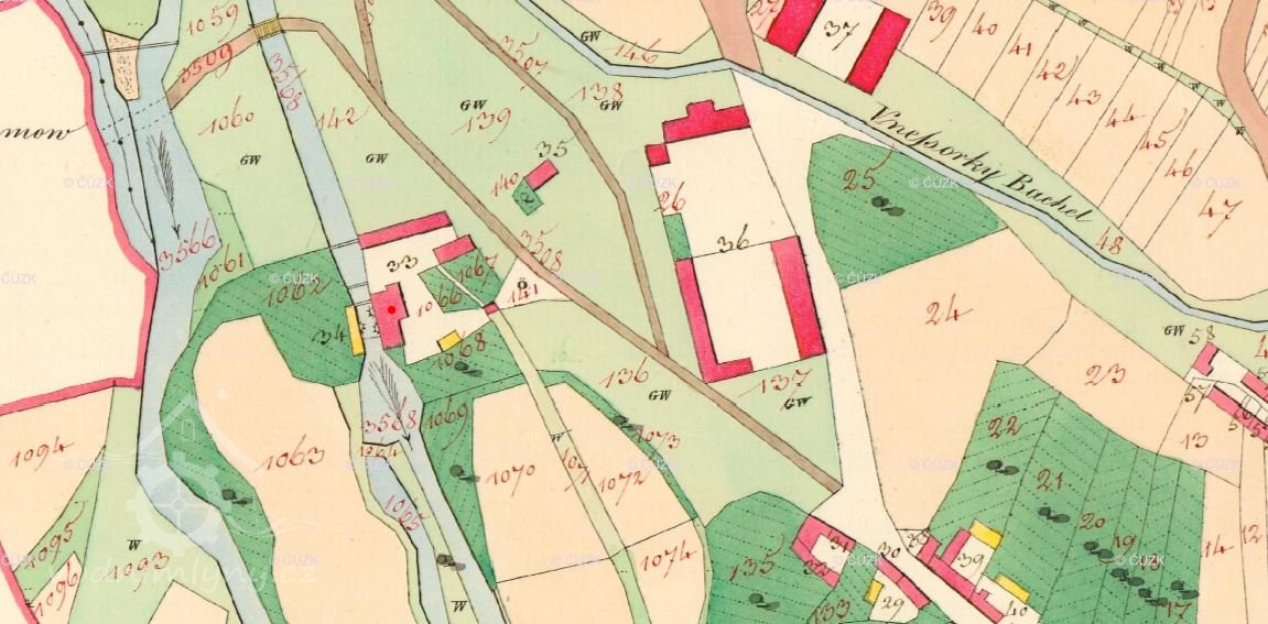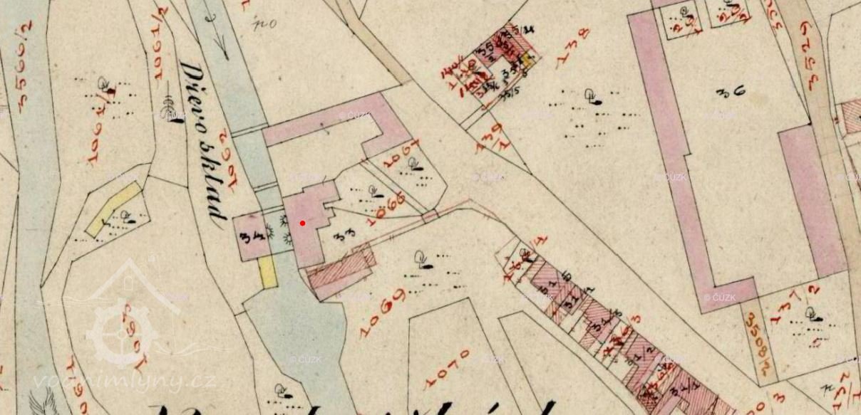Mlýn zobrazován již na I. vojenském mapování. (JV)