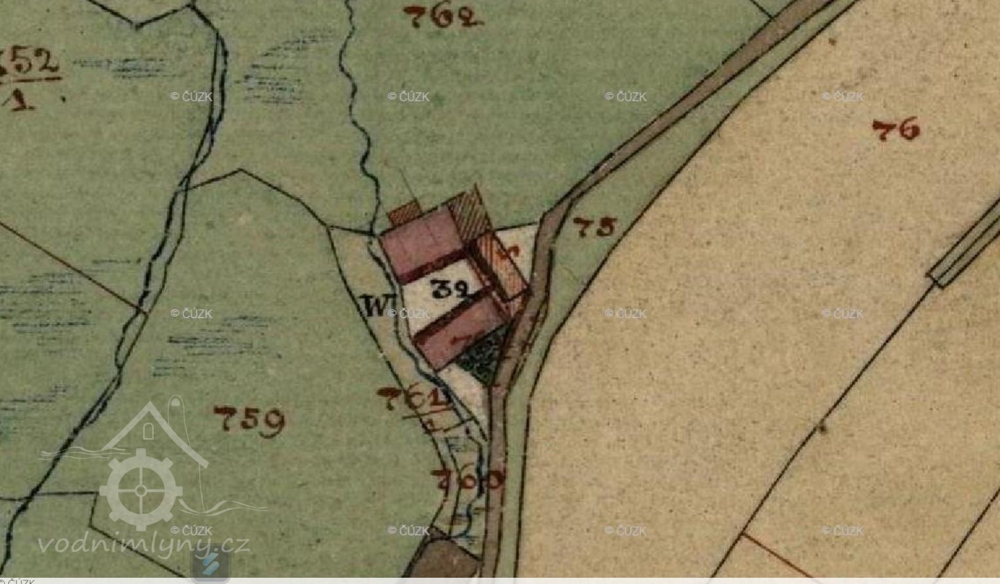 Počáteční voda z luk nadržuje se v mlýnské nádržce. Z nádržky se vede voda do žlabu 34 cm širokého a 25 cm vysokého rourou 30 cm vysokou a 20 cm ve světlosti širokou, jenž na straně nádržky zakrývá stavítkem. Na dně žlabu je pro jalový odpad vody zřízen otvor 8 cm do čtverce měřící. Celkový spád je 3,7 m.