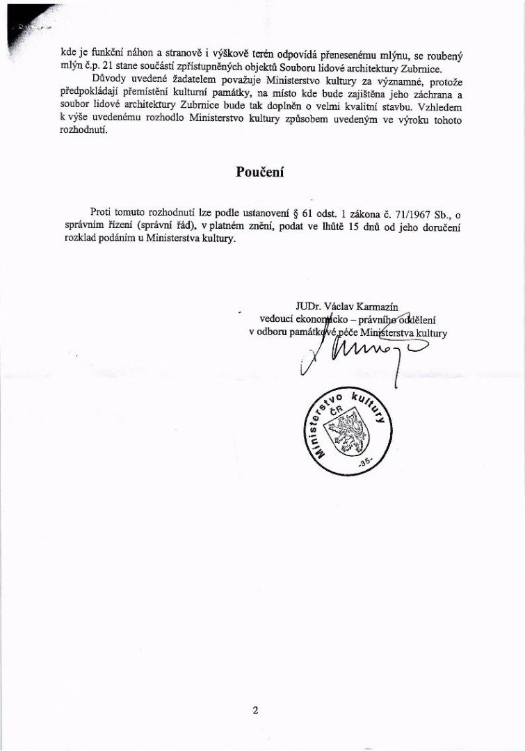 2008 přenesen na místo mlýna Týniště čp. 28 ve skanzenu v Zubrnicích.