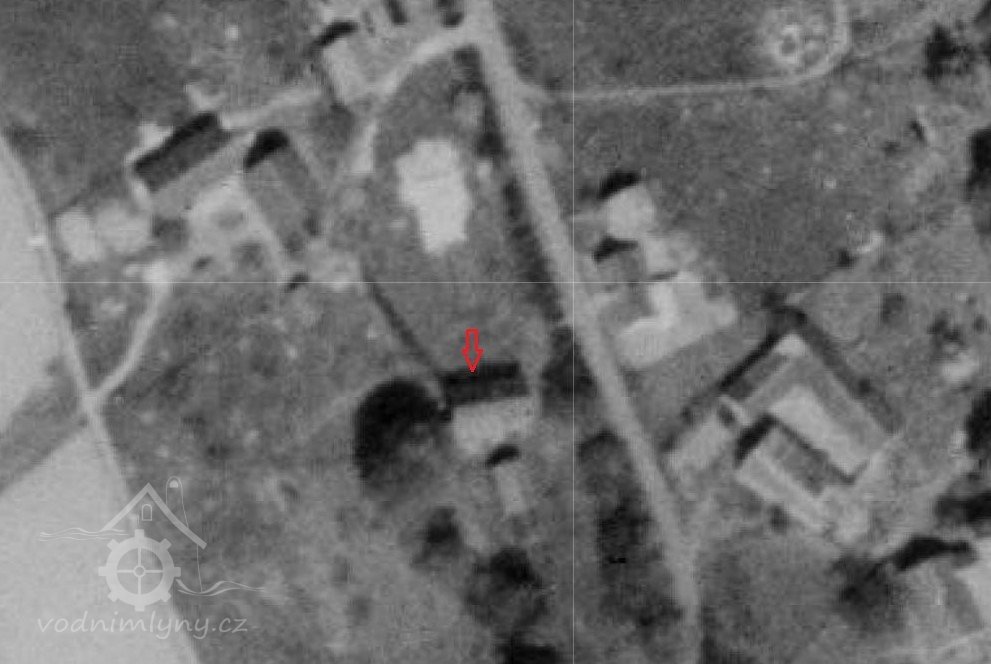 Na leteckém snímku z roku 1954 budova mlýna ještě stojí.