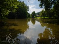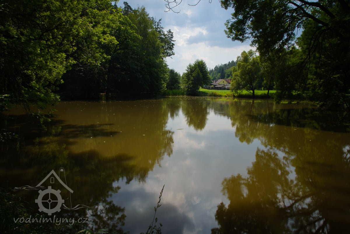 Rybník čp. 173 před mlýnem jest na suchu, velká voda v r.1888 jez rybníka při levé straně čelní hráze odplavila.