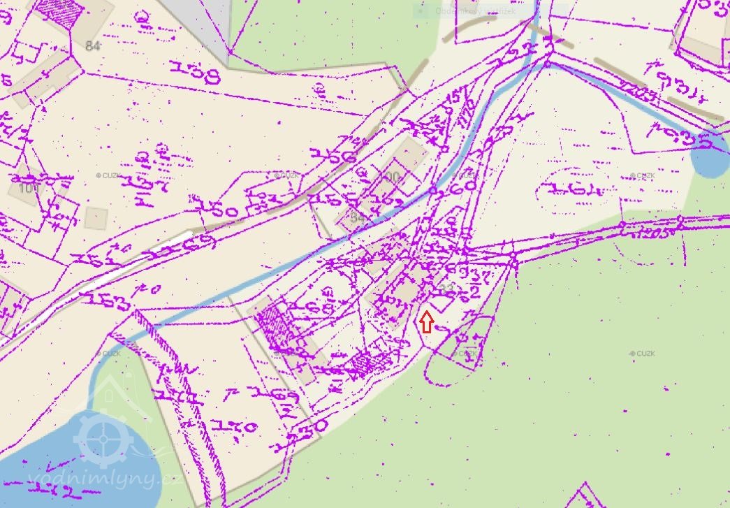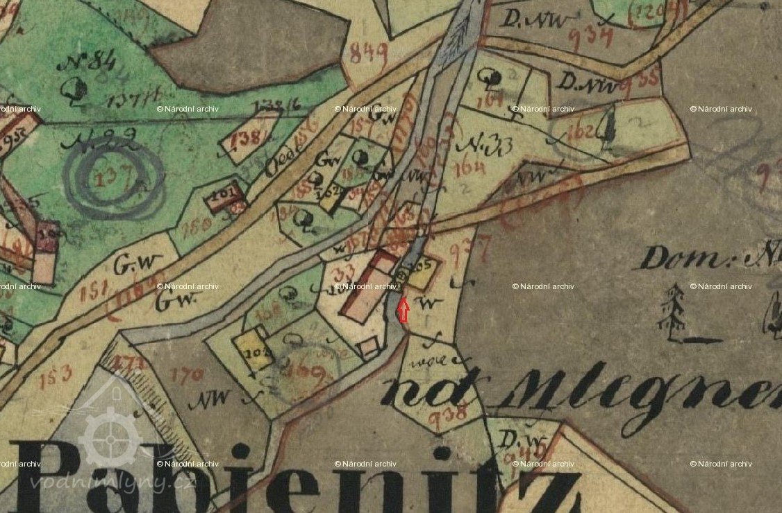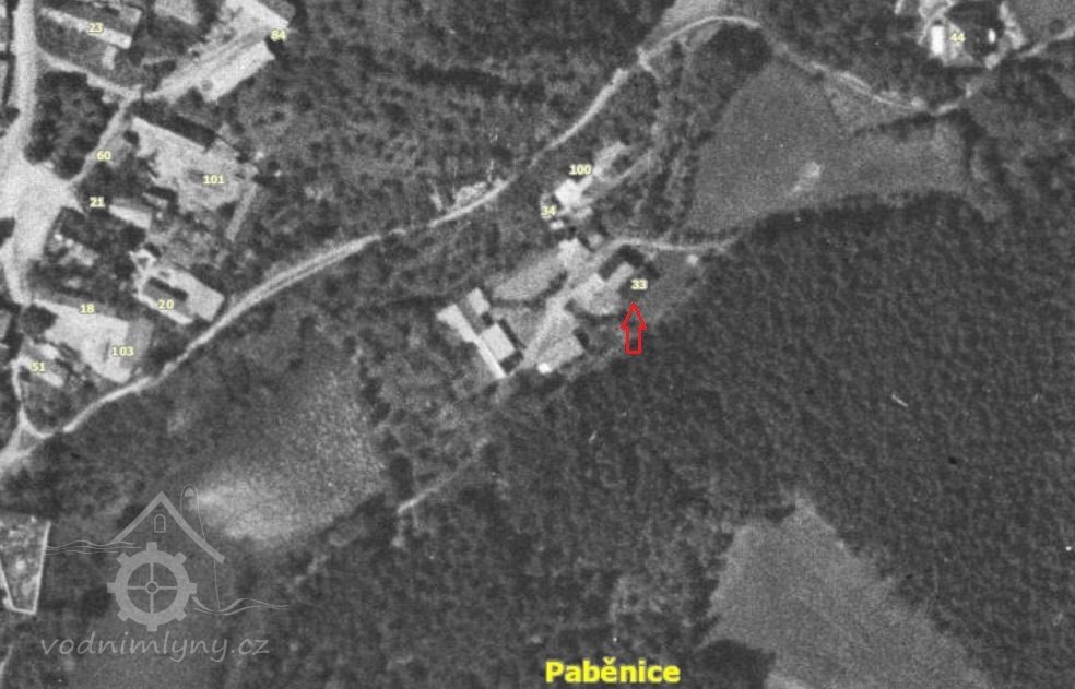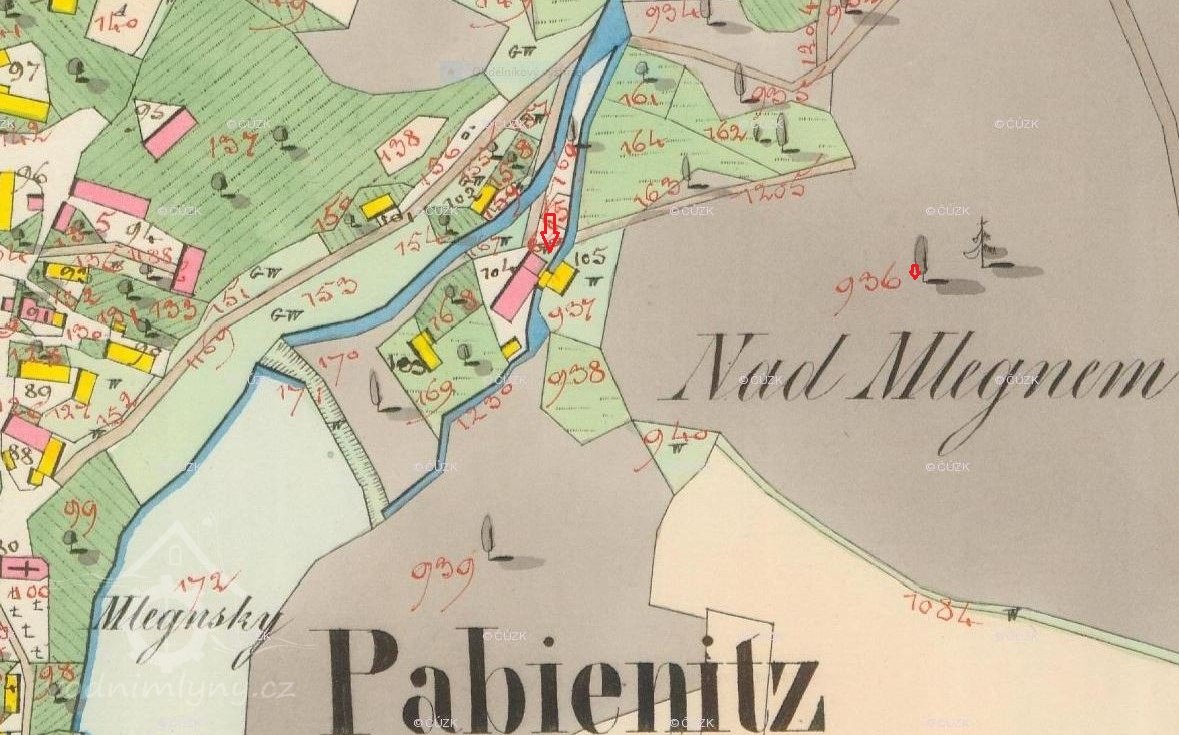 Mlýn čp. 33 jest poháněn vodou z potoka Klejnárky, (chyba, jedná se o potok Paběnický, ústící do Klejnárky v Chedrbí) která zadržována jest v rybníce č. kat. 172, který je majetkem mlynáře a má výměr 0,5158 ha.