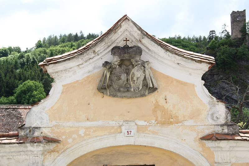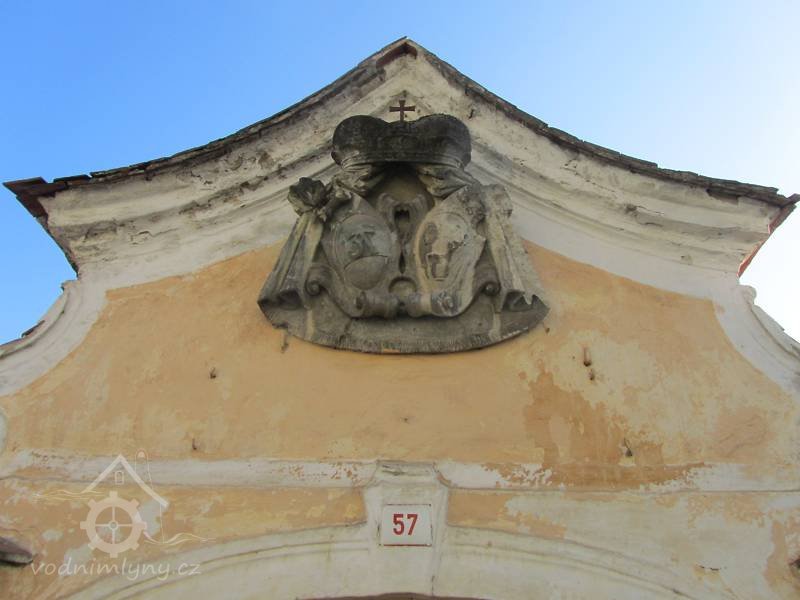 Barokní vstupní brána s erbovním znakem a navazující ohradní zdí je hodnotnou architektonickou součástí souboru budov vodního mlýna.