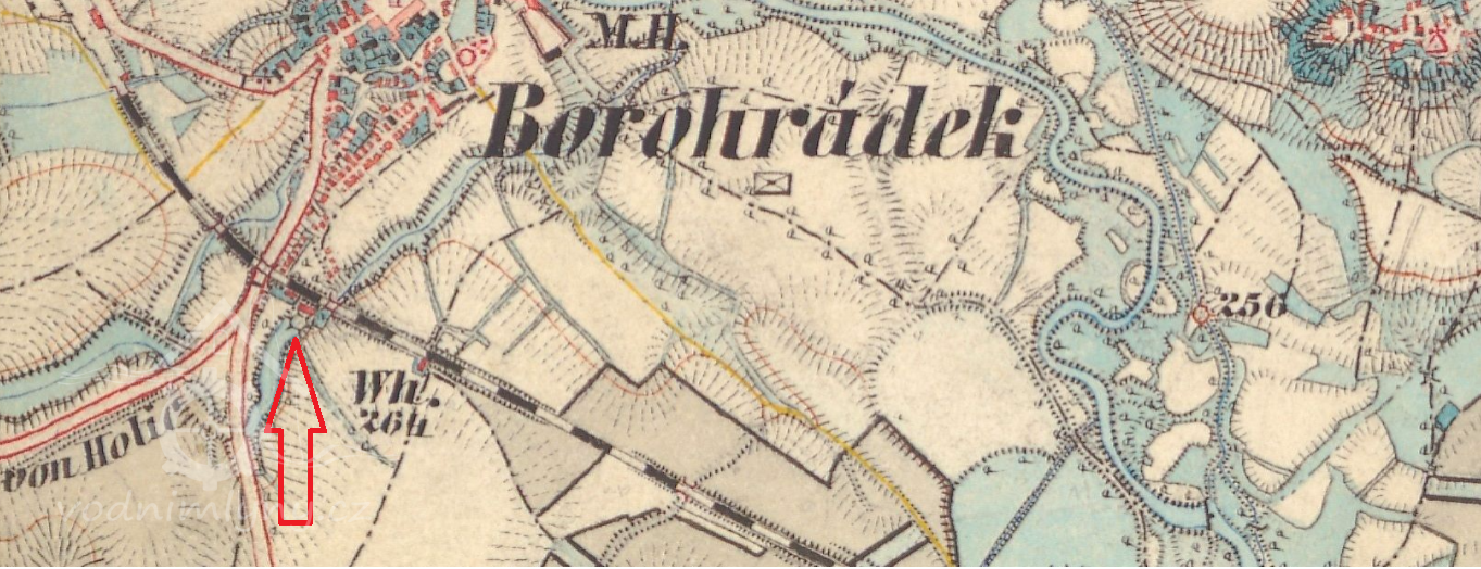 Novější mlýn v Borohrádku, od města odříznutý železničním náspem.