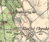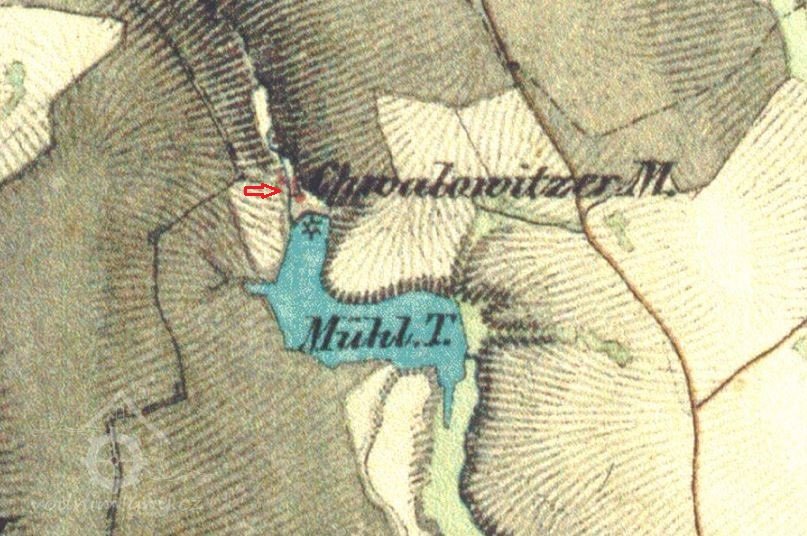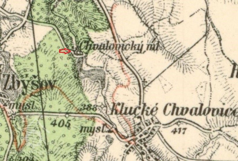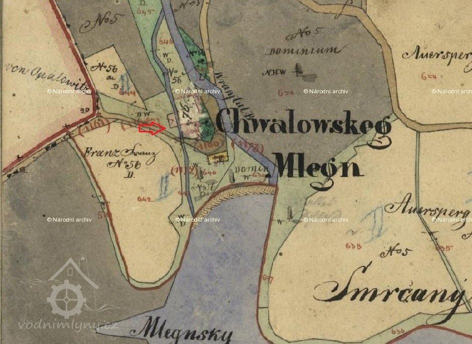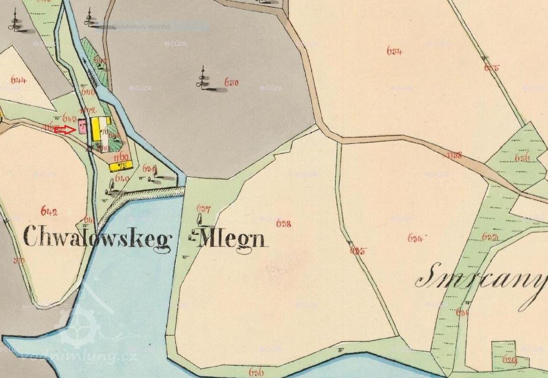 1925: Voda odebírá se z rybníka č. k. 511 (patřícího ku statku Klucké Chválovice) náhonem a odtéká odpadem do hlavního potoka č. k. 1172. Mlýn je na stavební parcele 76 a 77 - číslo popisné 56 obce Klucké Chválovice a nachází se na levém břehu hlavního potoka.