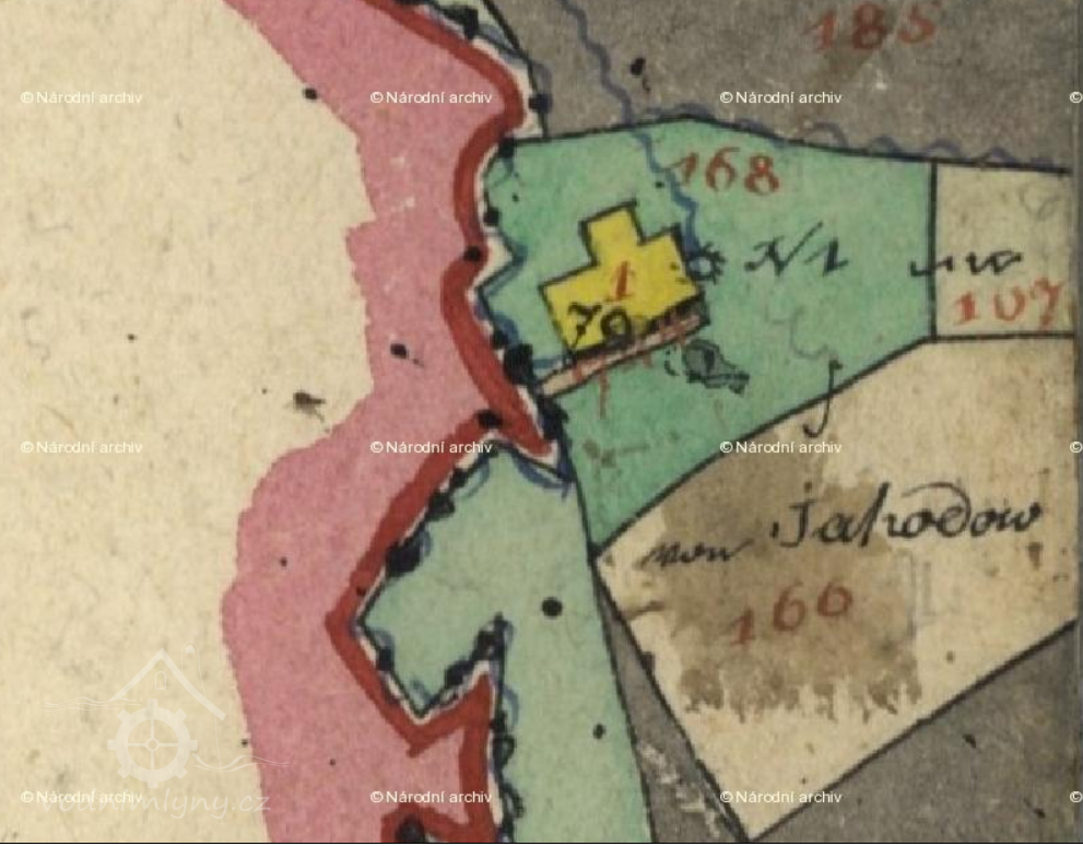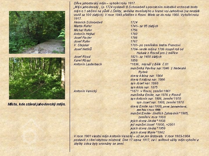 Mlýn jahodovský , l. p. 1724 vystavěl H. Schnoebell s povolením milostivé vrchnosti tento mlýn o 1 složení na půdě J. Šklíby, sedláka roveňskýho u hranic vsi Jahodova (na nestálé vodě za 100 zlatých).