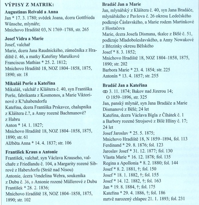 Od poloviny 19. století v čp. 40 žil rod Bradáčů, kteří jsou v matrikách uváděni jako mlynáři. Prvním mlynářem z tohoto rodu byl Jan Bradáč, uváděný v matrice jako „mlynářský z Kláštera č. 40“. Jan Bradáč pocházel z mlynářského rodu. Byl synem mlynáře stejného jména z Pavlova čp. 26 okresu Ledečského podkraje Čáslavského. Za manželku měl Marii, dceru tkalce Josefa Dismana z Bělé pod Bezdězem. V 70. a 80. letech 19. st je vystřídal jejich syn Jan s manželkou Kateřinou, rozenou Bíglovou z Číhátek čp. 1. Sňatek uzavřeli 3. 11. 1874, oběma bylo 24 let. V zápisech u jejich sňatku je Jan uváděn jako „panský mlynář“. V Klášteře č. 40 se jim v letech 1875 až 1893 narodilo celkem 11 dětí.