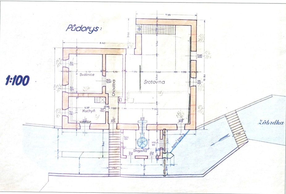 1923: 2 stavidla. Stavidlo vpouštějící vodu k turbíně má šířku 2,63 m a výšku 1,19 m, stavidlo jalové má šířku 2,14 m a výšku 0,94 m.