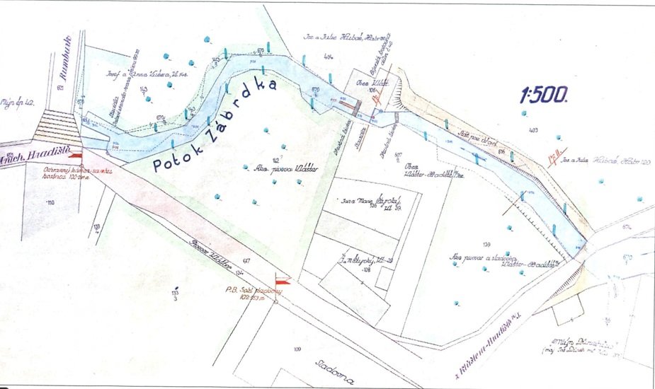 Na toku Zábrdky existovala 3 stavidla. Jedním se vpouštěla voda ke kolu a ostatní dvě regulovala hladinu vody v potoce. První mělo šířku 4 stopy a výšku 28 palců a 6 čárek, druhé šířka 4 stopy a výška 22 palců, třetí 4 stopy 1 palec široké, 35 palců vysoké.