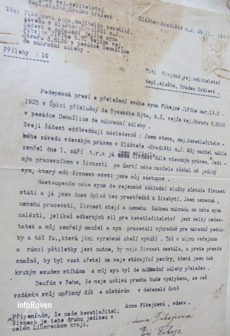 Pravděpodobně v průběhu roku 1933 koupil bývalou šrotovnu Jan Fikejz a provozoval zde kovotlačitelství. Po smrti Jana Fikejze pokračovala v živnosti jeho manželka a se synem Jiřím.