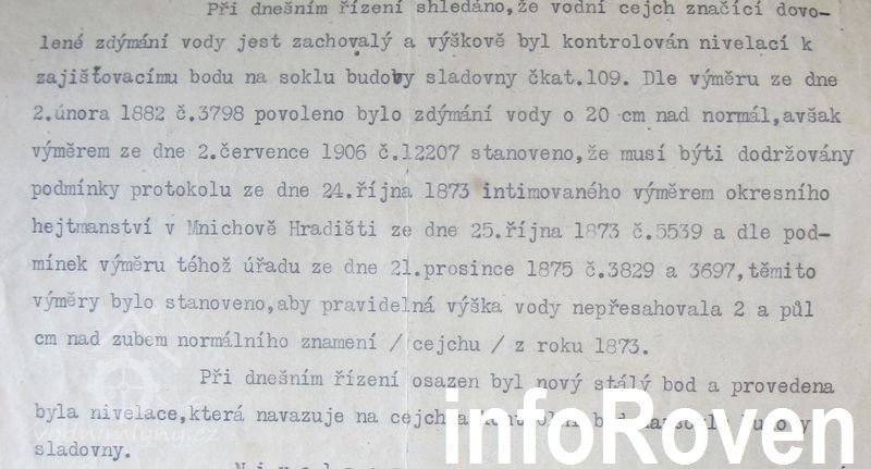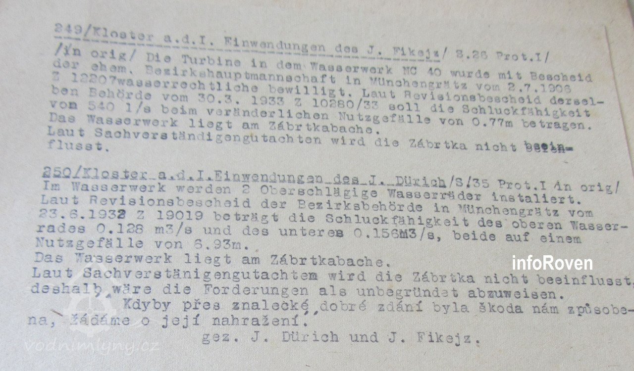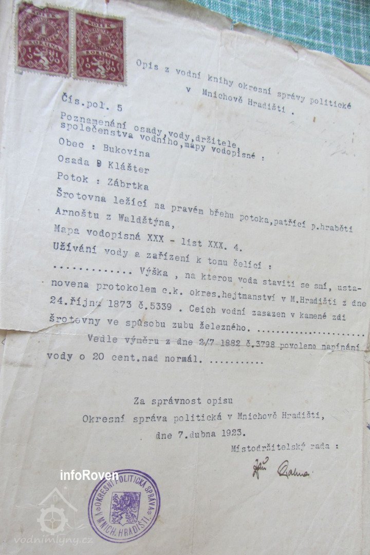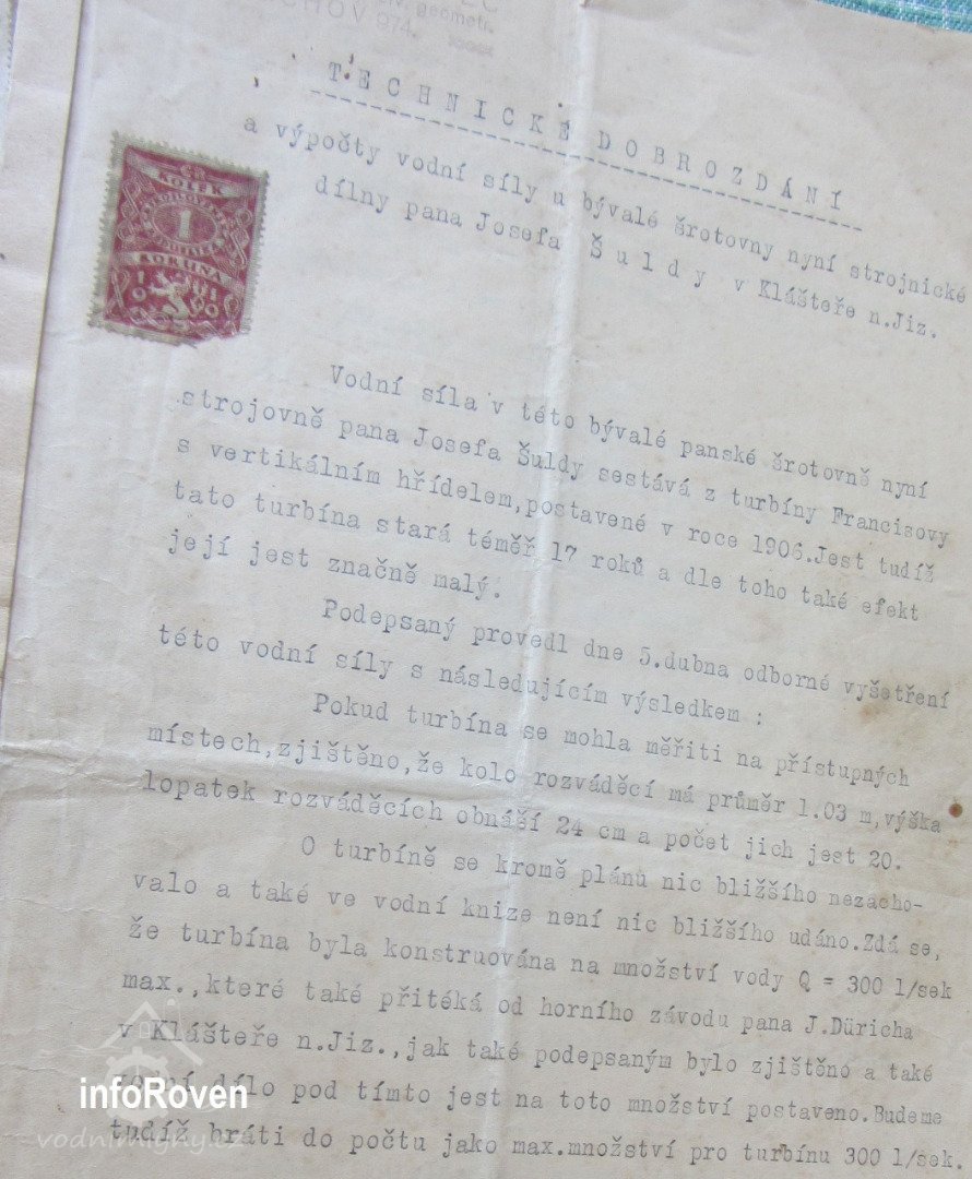 Popis24.5.1906 podala kancelář hraběte Arnošta z Valdštejna žádost na povolení přestavby vodního kola na turbínu. 22.6.1906 komisionelně kolaudována, 2.7.1906 úředně povolen provoz.